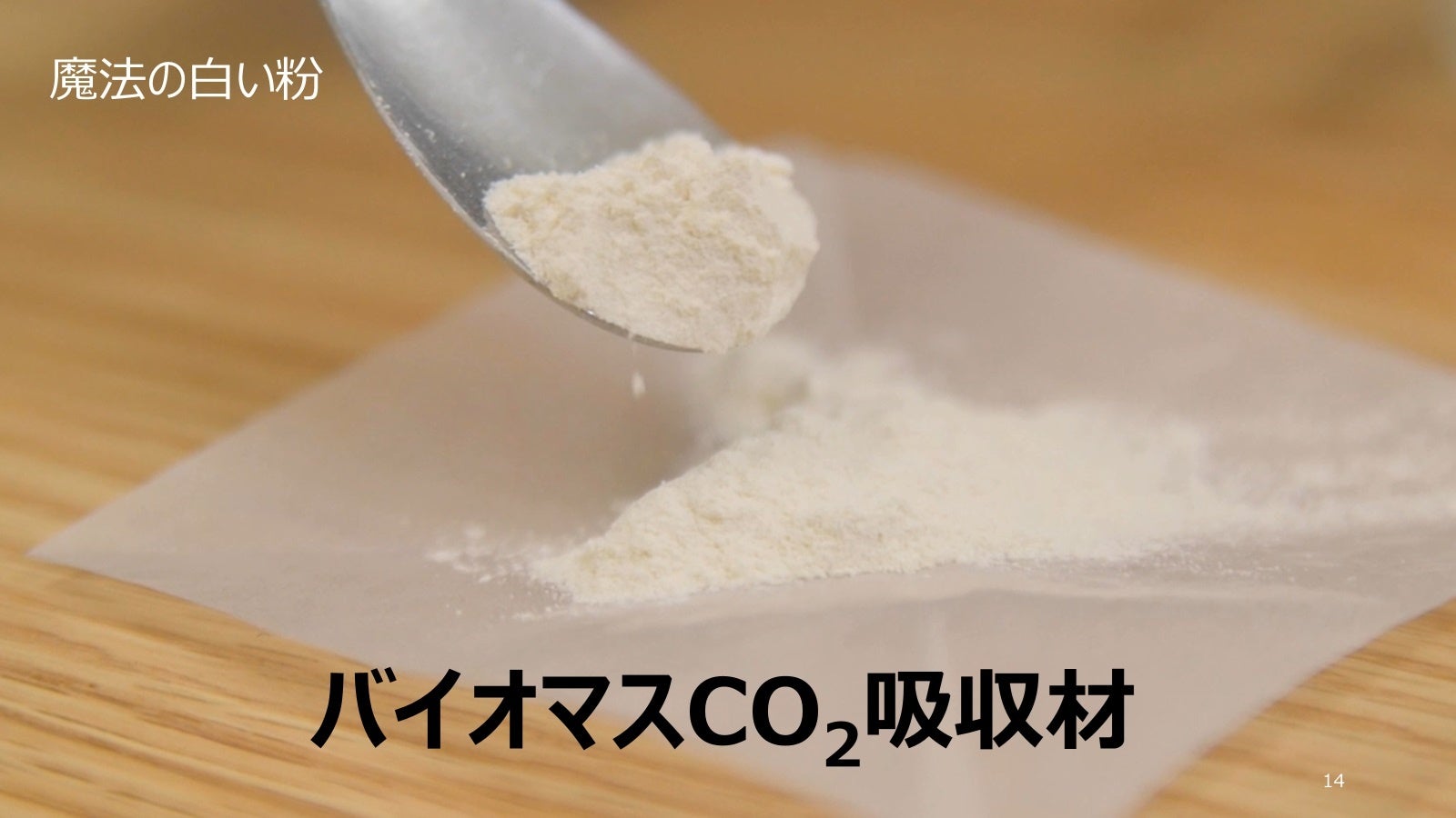 ・バイオマスCO2吸収材は白色の粉末状の材料で、添加剤として利用可