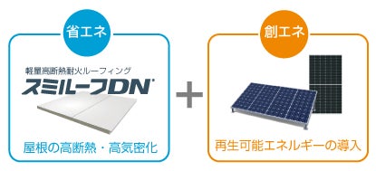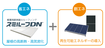 また、ZEB(ネット・ゼロ・エネルギー・ビル)建築物基準達成のため、「スミルーフDN®」によるフラットな屋上を有効利用し『創エネ』として太陽光発電パネルを設置する需要が高まっています。