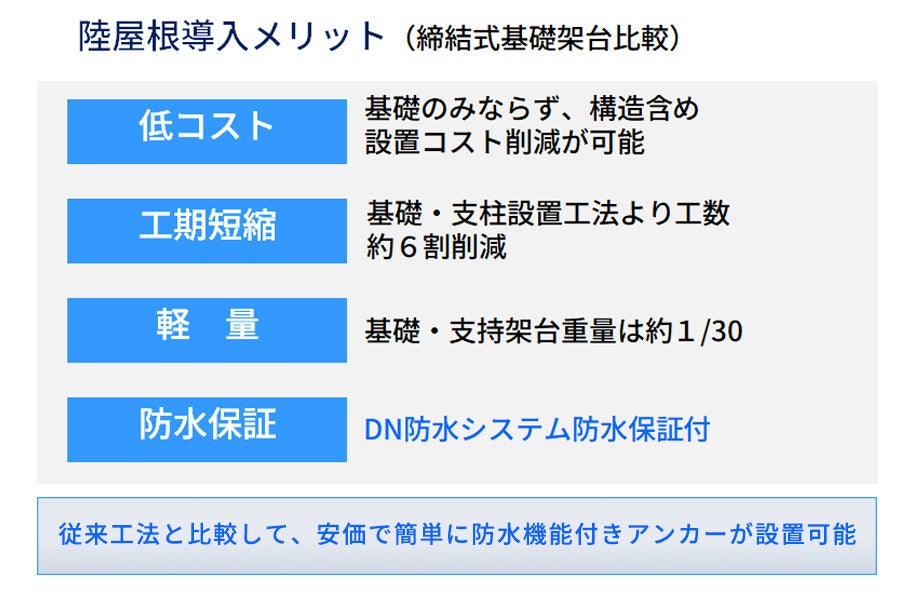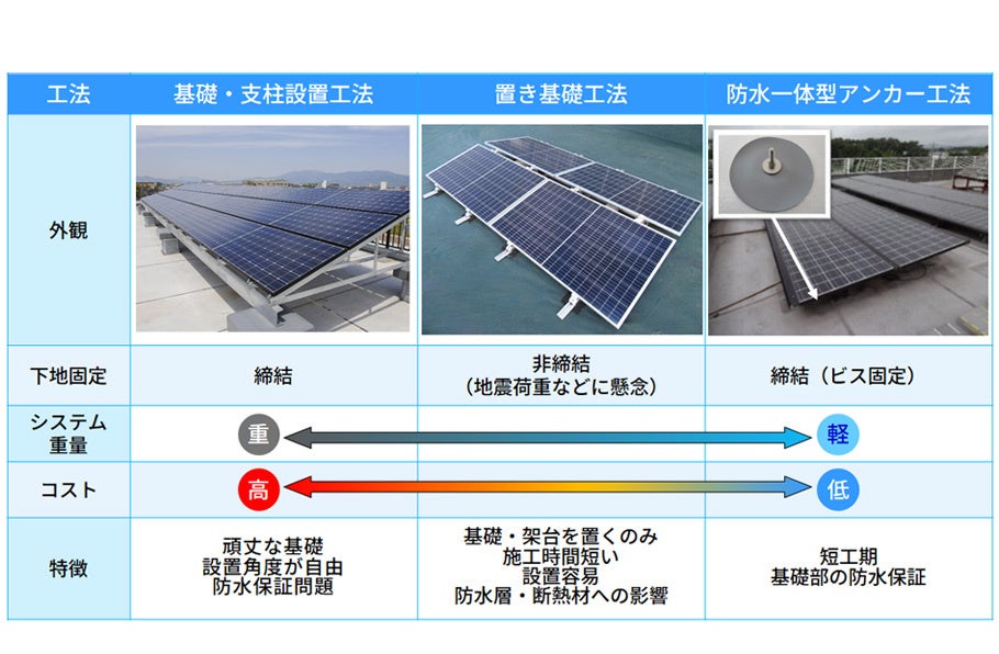 通常、防水工事とともに太陽光発電パネルを屋上に設置する場合には、架台基礎を設置する必要がありますが、開発した軽量ソーラーパネル設置工法は、シート防水一体型乾式軽量アンカーをスミルーフDN®の上から母屋に固定し、軽量架台を使用することで、スミルーフDN®の施工後に簡易に設置することができます。