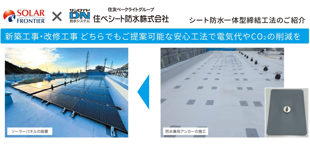 陸屋根向けのシート防水一体型締結工法は、住ベシート防水とソーラーフロンティアの共同開発です。