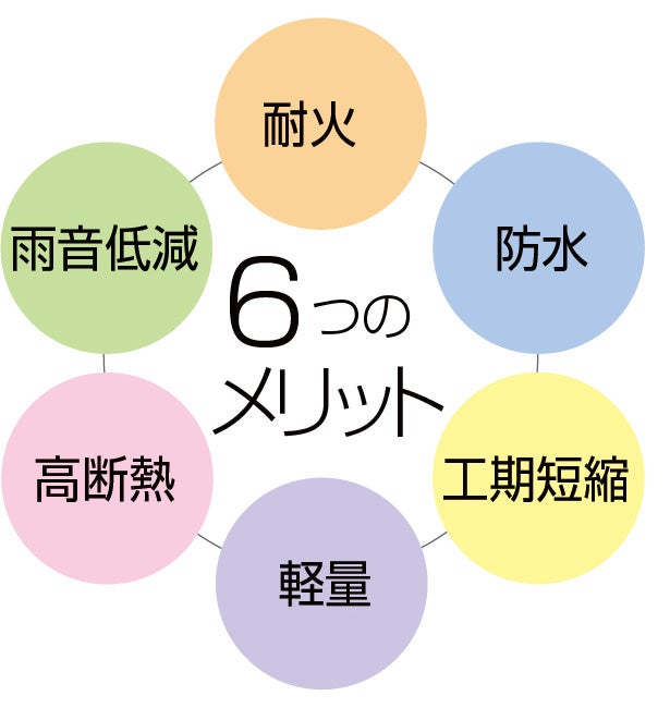 従来仕様のDNルーフボードの表面鋼板に、当社で20年以上の使用実績がある露出用塩ビ被覆鋼板を使用した、全く新しい防水屋根材パネルがスミルーフDN®です。優れた耐久性や軽量化はもちろんのこと、屋根業者でも一定の技能習得により、防水の施工が簡単にできるようになったことで、工期短縮と人手不足による現場での負担軽減をねらった、今まさに時代が求める新建材です。