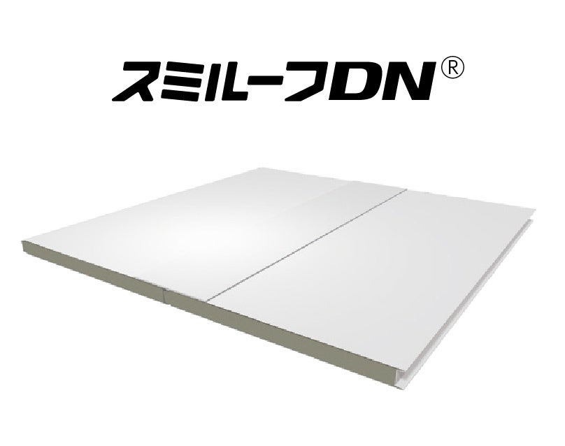 「スミルーフDN®」は、露出シート防水用塩ビ被覆鋼板を表面材に使用し、屋根構造部材としては非常に軽量(約10kg/m²)で施工人工の削減や施工工期の短縮に有効な屋根材です。さらに、高い断熱性を有するとともに屋根30分耐火構造の認定を30mm、45mm、60mmの厚さで取得、シート防水性能に優れた商品となっています。