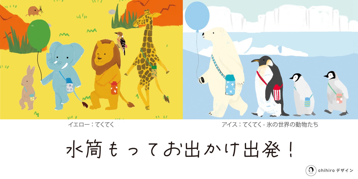 愛らしい動物たちが、それぞれ水筒をさげて、お散歩中! 水筒洗いが happy ! になるよう想いをこめて2種類のデザイン(イエロー / アイス)をご用意。 自分の水筒を、子どもたちがすすんで洗うようになるかもです。
