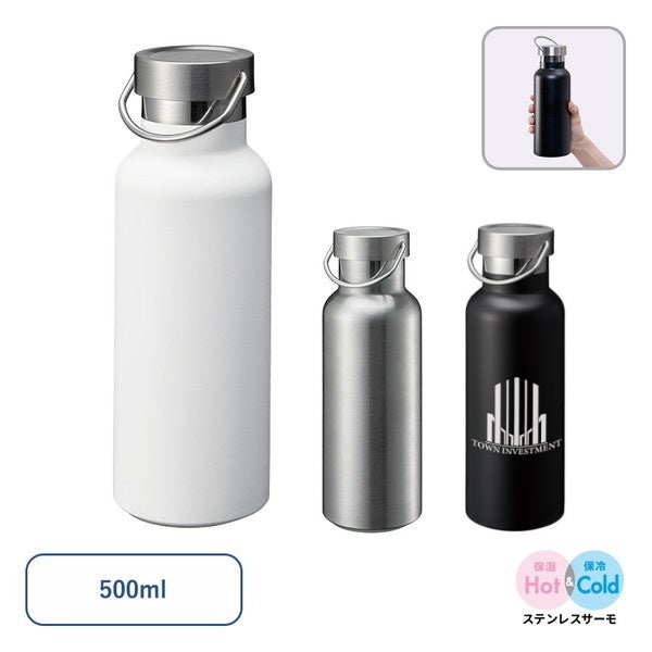 携帯しやすいハンドル付のサーモステンレスボトル。