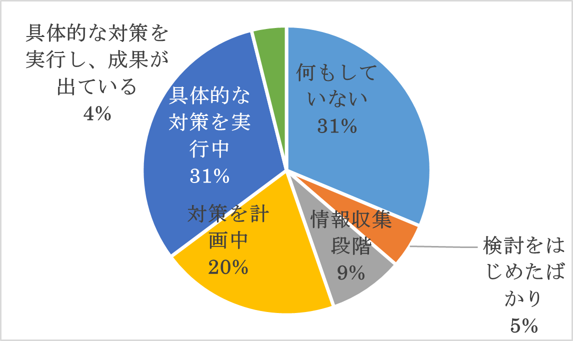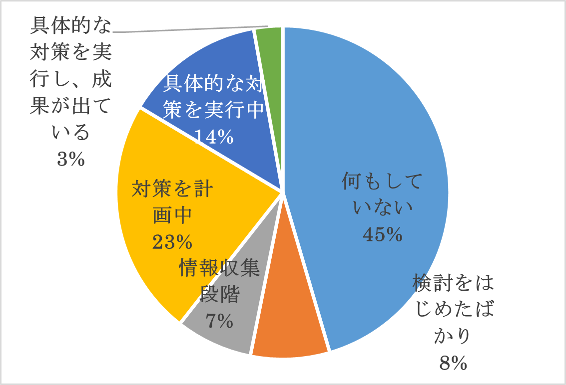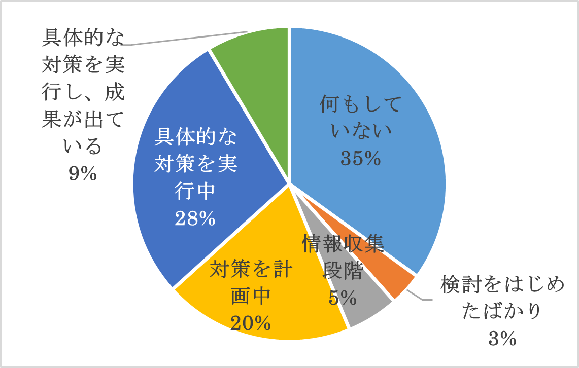 ●「具体的な対策を実行し、成果が出ている」企業は、大企業で10%以下、中小企業では3%と、事業規模を問わず成功例はごくわずかである。 |