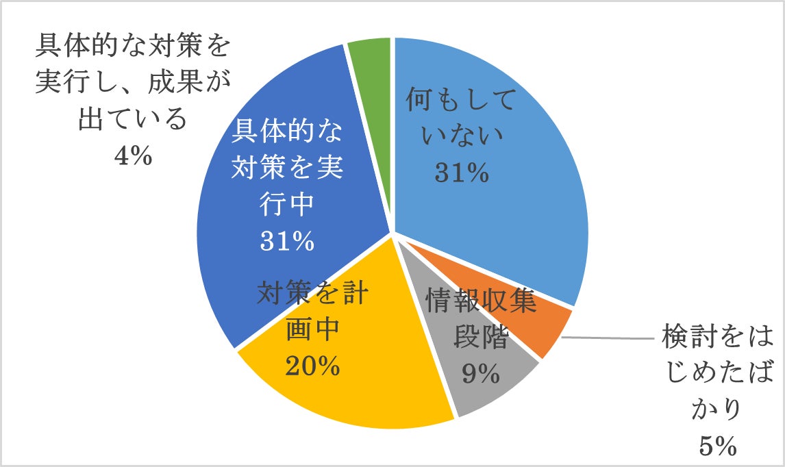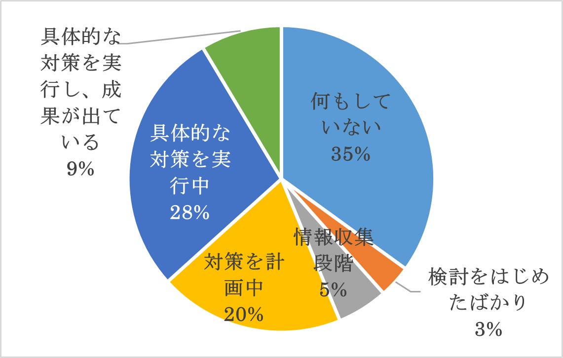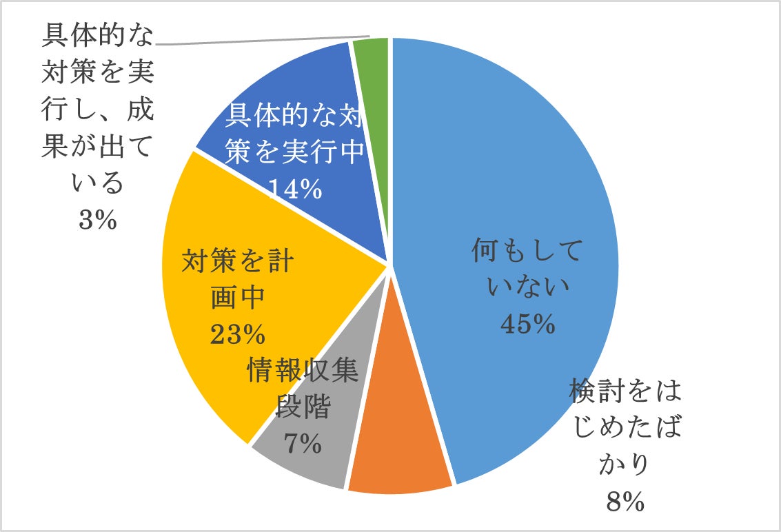 ●「具体的な対策を実行し、成果が出ている」企業は、大企業で10%以下、中小企業では3%と、事業規模を問わず成功例はごくわずかである。  |