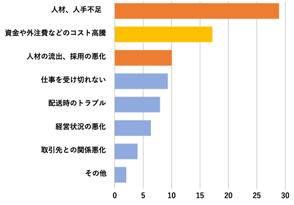 ●「人材・人手不足」への影響が最多で、「人材の流出・採用の悪化」と合わせて、社内リソース不足に対する課題が表面化している。 ●また「賃金や外注費などのコスト高騰」への影響も大きく、人材不足を背景としたコスト増大への懸念も大きい。 |