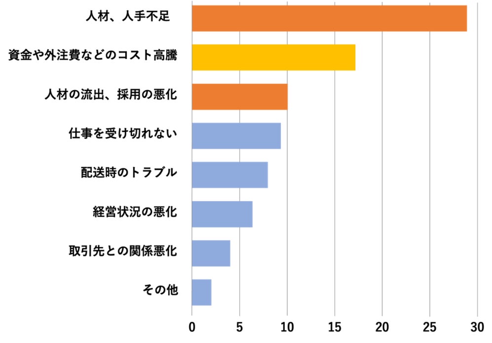 ●「人材・人手不足」への影響が最多で、「人材の流出・採用の悪化」と合わせて、社内リソース不足に対する課題が表面化している。 ●また「賃金や外注費などのコスト高騰」への影響も大きく、人材不足を背景としたコスト増大への懸念も大きい。  |