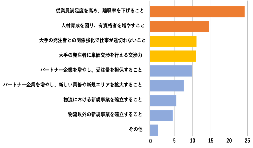 ●回答上位に「従業員満足度の向上、離職率の改善」「人材育成、有資格者の増加」といった、福利厚生やスキルアップの機会提供を通したリテンション施策に関する対応が並んだ。 ●また「大手発注者との関係強化」や「単価交渉の強化」といった、より高い利益率の案件獲得に向けた動きが必要という声も多い。 |