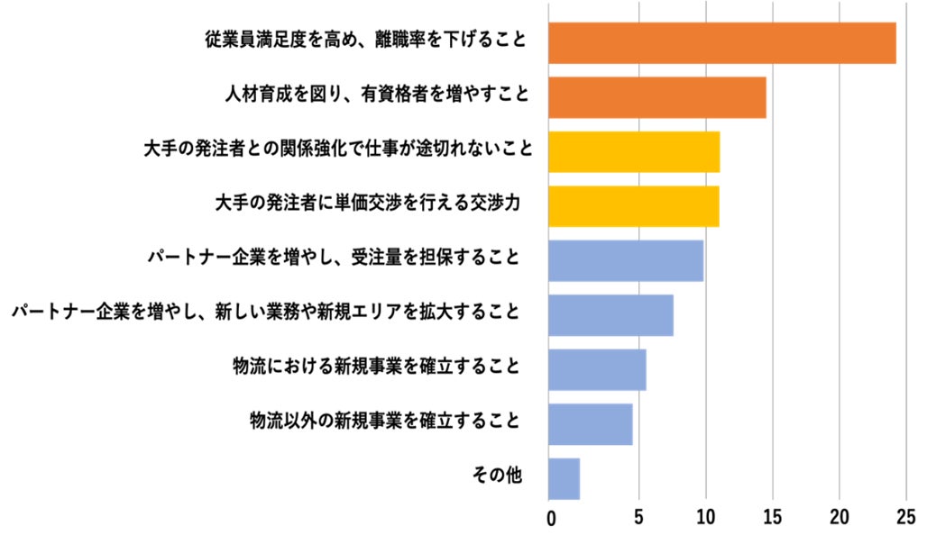 ●回答上位に「従業員満足度の向上、離職率の改善」「人材育成、有資格者の増加」といった、福利厚生やスキルアップの機会提供を通したリテンション施策に関する対応が並んだ。 ●また「大手発注者との関係強化」や「単価交渉の強化」といった、より高い利益率の案件獲得に向けた動きが必要という声も多い。  |