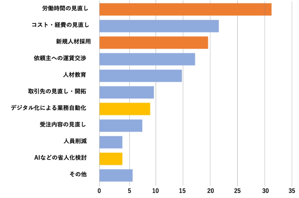 ●「労働環境の管理見直し」「新規人材採用」「人材教育」といった、人材の確保や福利厚生に関する対応が多く挙がった。 ●一方で、「デジタル化による業務自動化」「AIなどの省人化検討」といった業務体制のDX化に取り組む企業も出てきている。  |