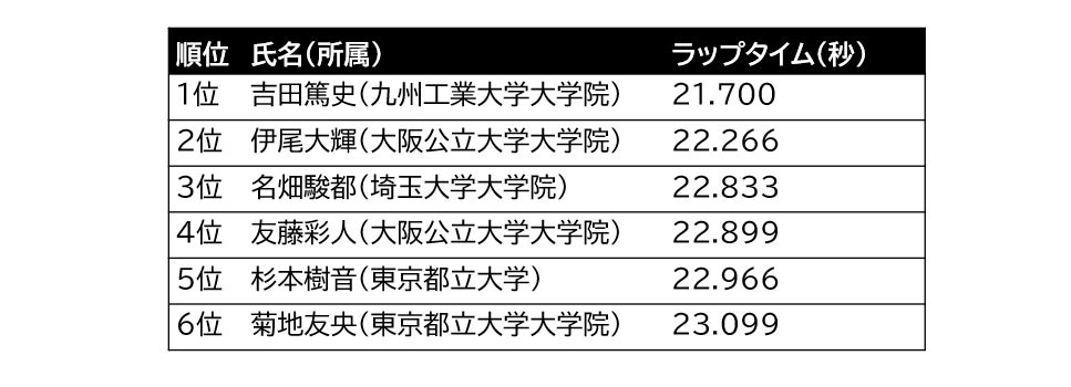 タイムアタック大会におけるラップタイム上位6名(学生参加者)の成績です。上位者には日本知能情報ファジィ学会事業委員会公認の電子表彰状を授与しました。詳細は、FSS2025公式HPをご参照ください。