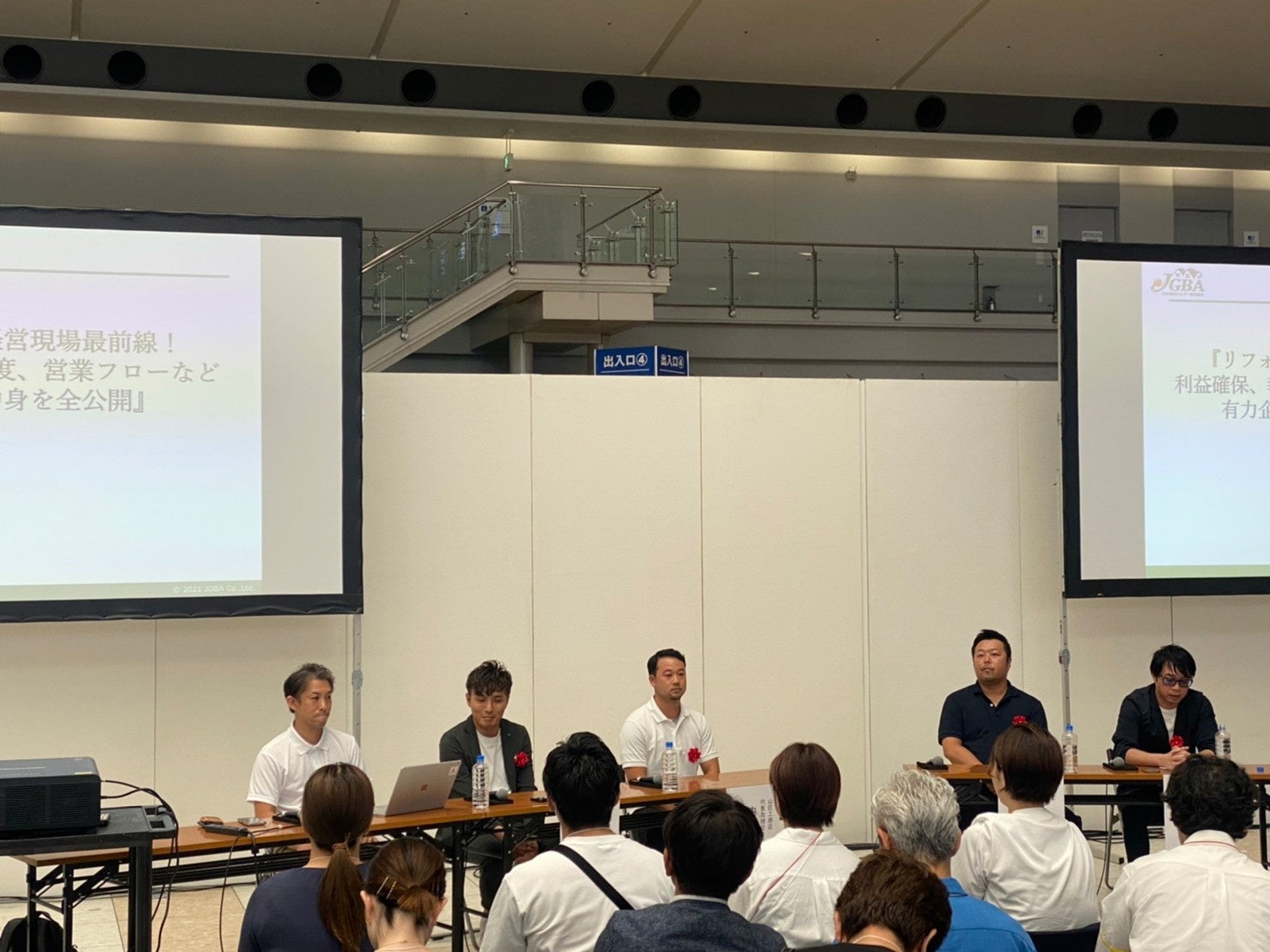 「リアル」にこだわった学びの機会を積極的に提供しているJGBAでは、会員企業の更なる情報共有と交流機会創出のため、総合展示会への出店も展開しております。昨年に引き続き、プロ向けの総合展示会「リフォーム産業フェア」(主催:リフォーム産業新聞社)に出展し、2日間で延べ1万4088人が来場しました。7月20日(木)には、同展示会内(アトリウム2)にて特別無料セミナーも開催。リアル・オンラインともに開催し、参加者は100人超となりました。会員企業のうち、リフォーム事業に注力しているSAKAI株式会社(本社:大分県大分市、代表取締役:臼井栄仁)、株式会社山匠工務店(本社:千葉県東金市、代表取締役社長:内山祐介)、株式会社晃家(本社:栃木県鹿沼市、代表取締役:渡辺智昭)、株式会社PLUS ONE(本社:奈良県奈良市、代表取締役:鳥井幸一)の4社のトップが集客方法や現場管理、アフターメンテナンスなどで注力していることなどをトーク。「近隣へのあいさつで持参する粗品の内容を工事の内容によって変える」といった、こだわりの細部までを率直かつ具体的に明かしました。
