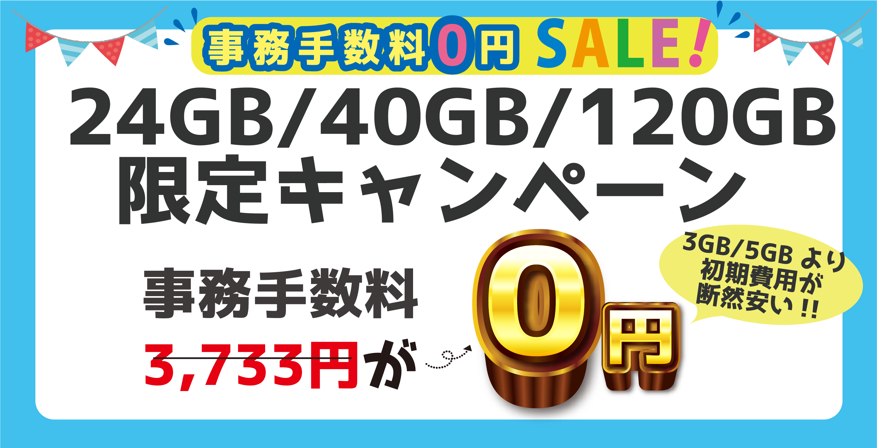 ・キャンペーンが適用されるのはご契約申込の際に24GB・40GB・120GBプランをお選びいただいた場合に限ります。ご契約申込の際に3GB・5GBプランをお選びいただいたお客様は通常の事務手数料3,733円がかかります。