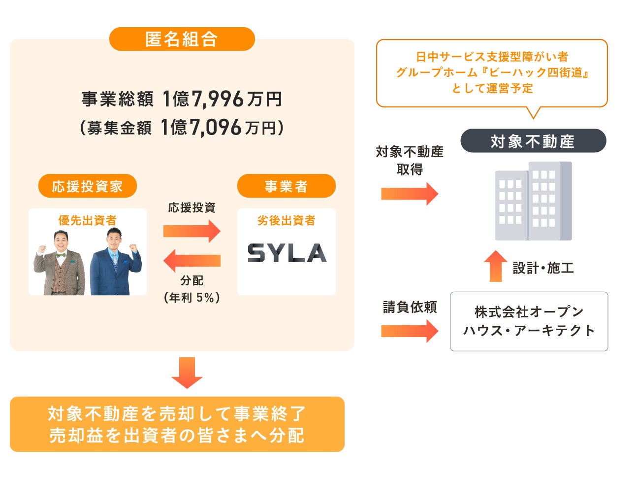 “世界中の不動産投資を民主化する。人生100年時代をテクノロジーと資産運用で豊かに。”をミッションに不動産クラウドファンディング国内会員数No.1『利回りくん』と投資用マンションの開発を手掛ける株式会社シーラ(本社:東京都渋谷区、代表取締役:湯藤 善行、以下「シーラ」)は、株式会社アニスピホールディングス(本社:東京都千代田区、代表取締役社長:藤田 英明、以下「アニスピホールディングス」)が手掛ける日中支援型障がい者グループホーム事業『ビーハック四街道』の開発型ファンド募集を5月29日(月)より開始いたします。事業総額は1億7,096万円です。