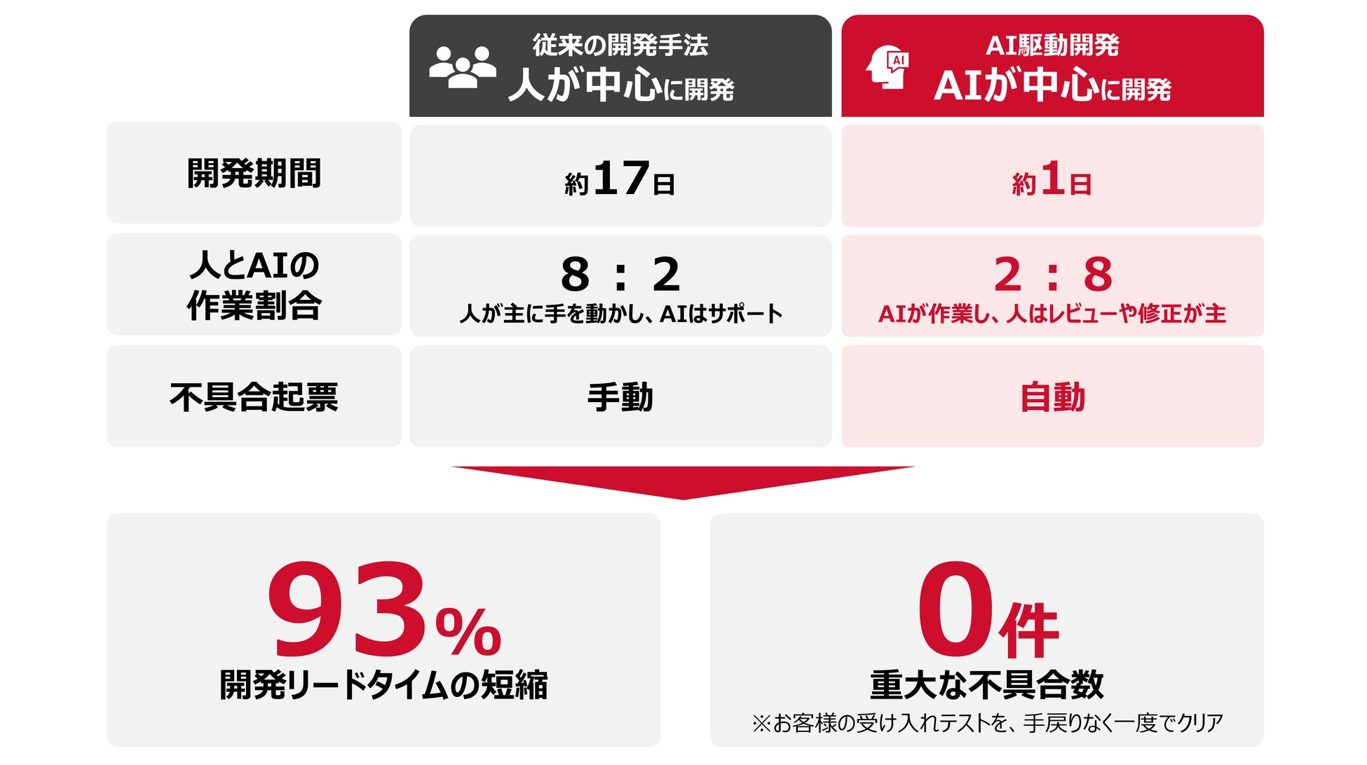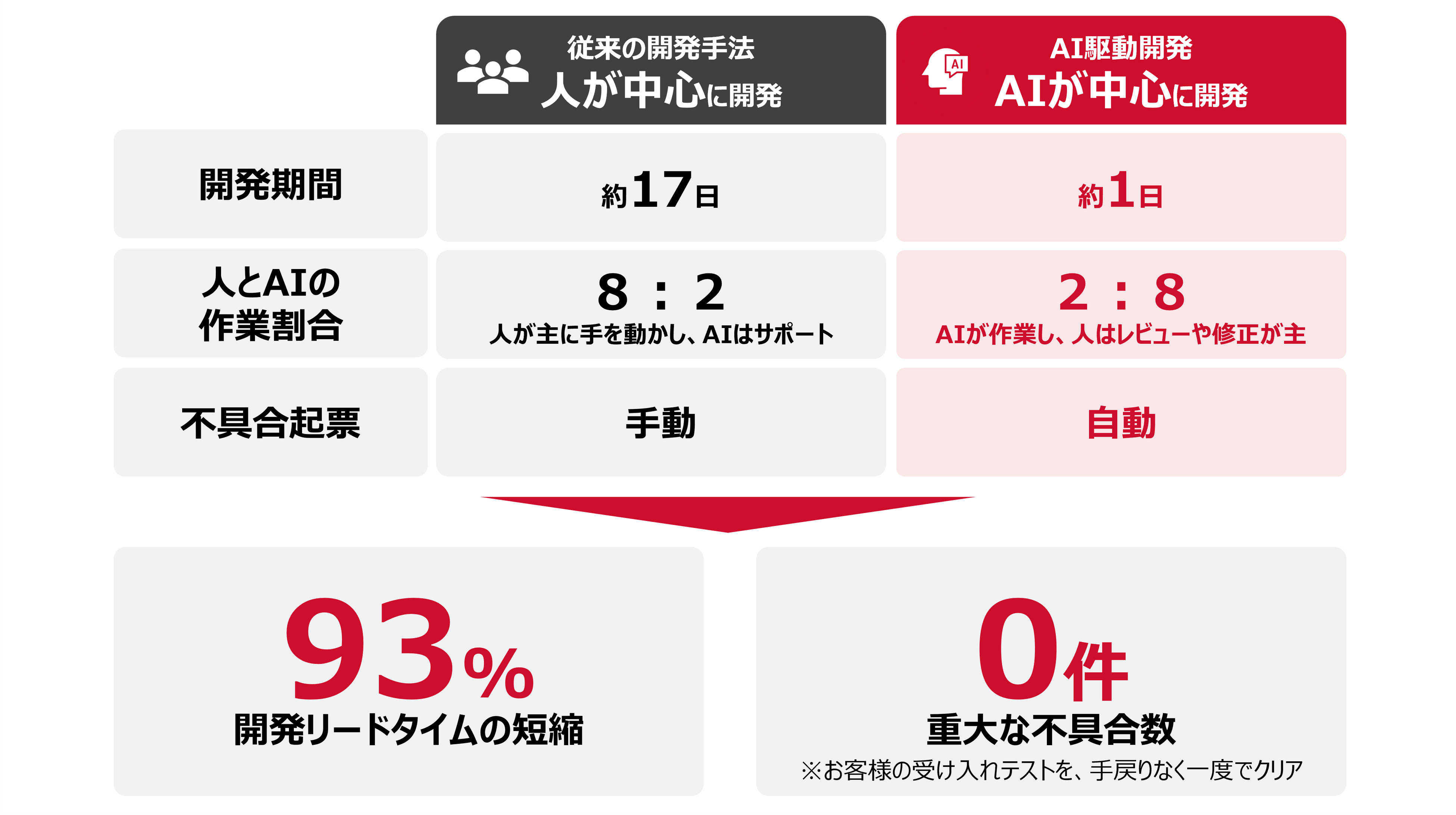 この仕組みにより、従来の人手による開発では17日程度を要していたプロジェクトを、約1日で完了させるとともに、重大な不具合ゼロという優れた品質を両立させることに成功した実際の事例もございます。