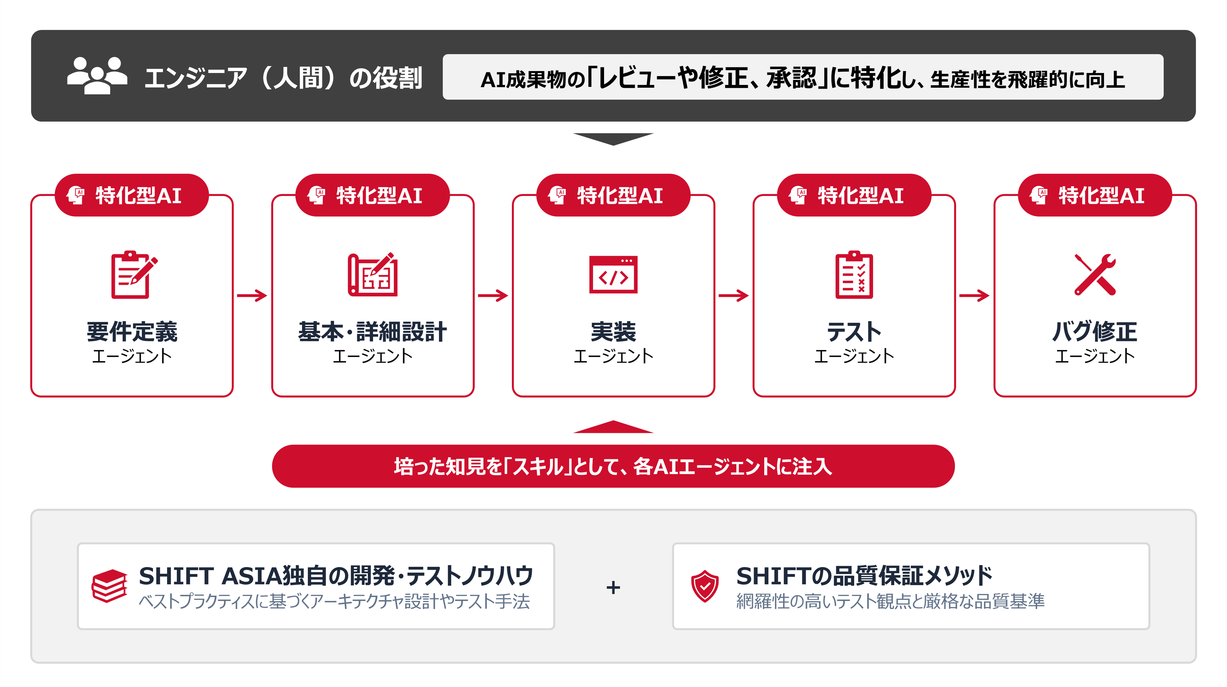 SHIFT ASIAがソフトウェア開発やテスト業務で積み重ねてきた実践的なノウハウと、SHIFTグループの強みである独自の品質保証メソッドを、AIのスキルとして組み込んでいます。これにより、一般的な生成AIにありがちな品質のブレを防ぎ、高品質な要件定義・設計・実装・テストを実現します。