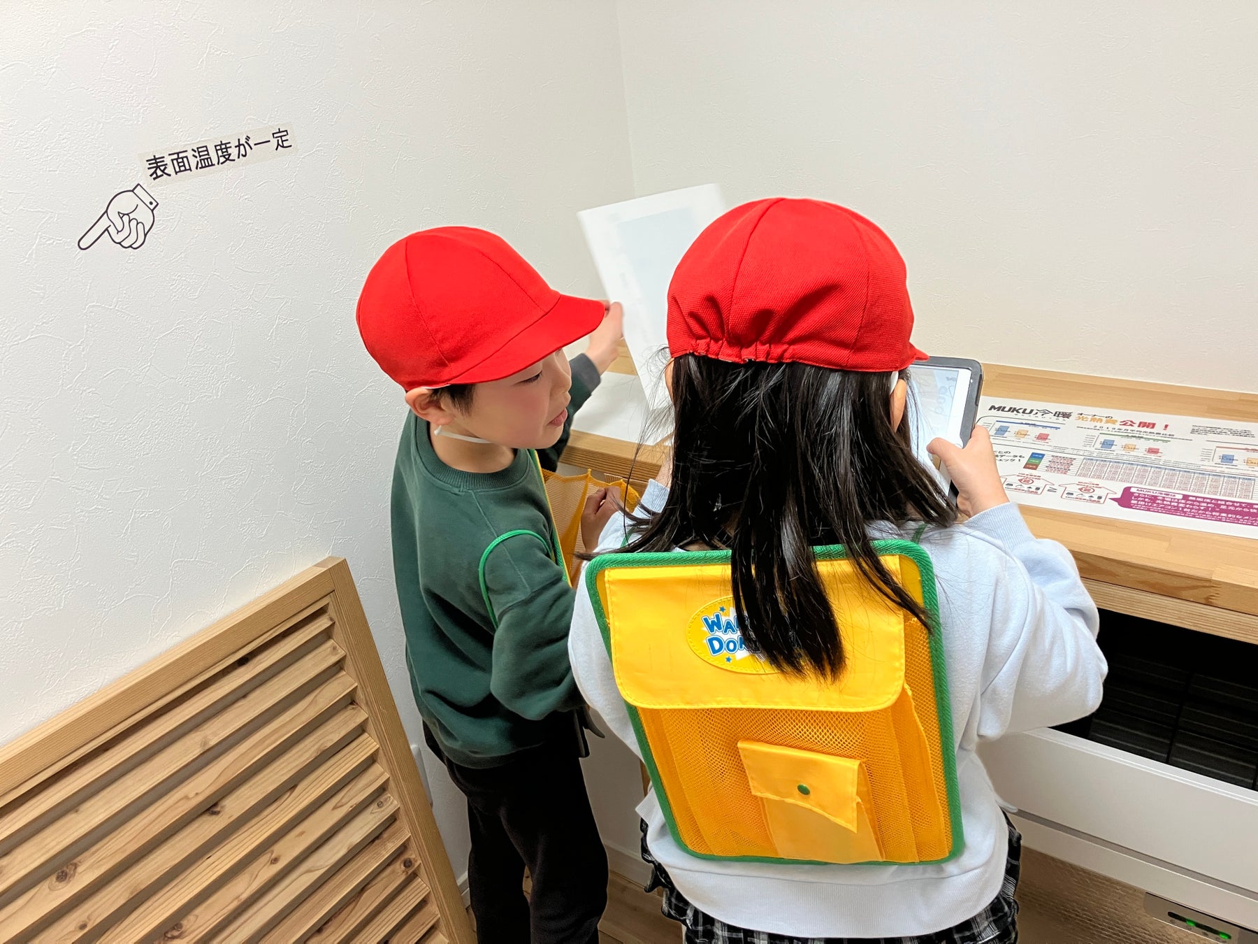 「みやぎ未来基準」とは、宮城の厳しい冬の寒さや地震のリスクに対応するため、独自の高い断熱性能と耐震性能を追求した当社独自の住宅基準です。子どもたちは、普段見ることができない壁の中の構造や最新設備を実際に「見て・触れて」体感し、地元の暮らしを守る工夫に目を輝かせていました。