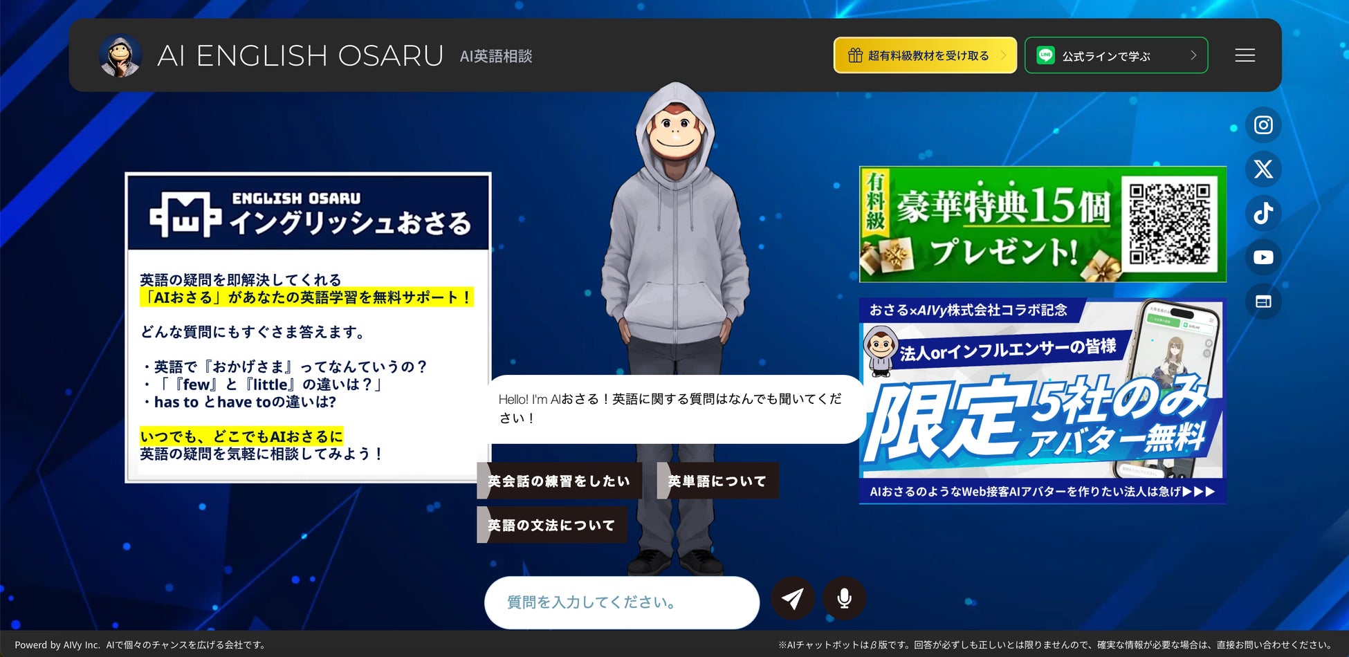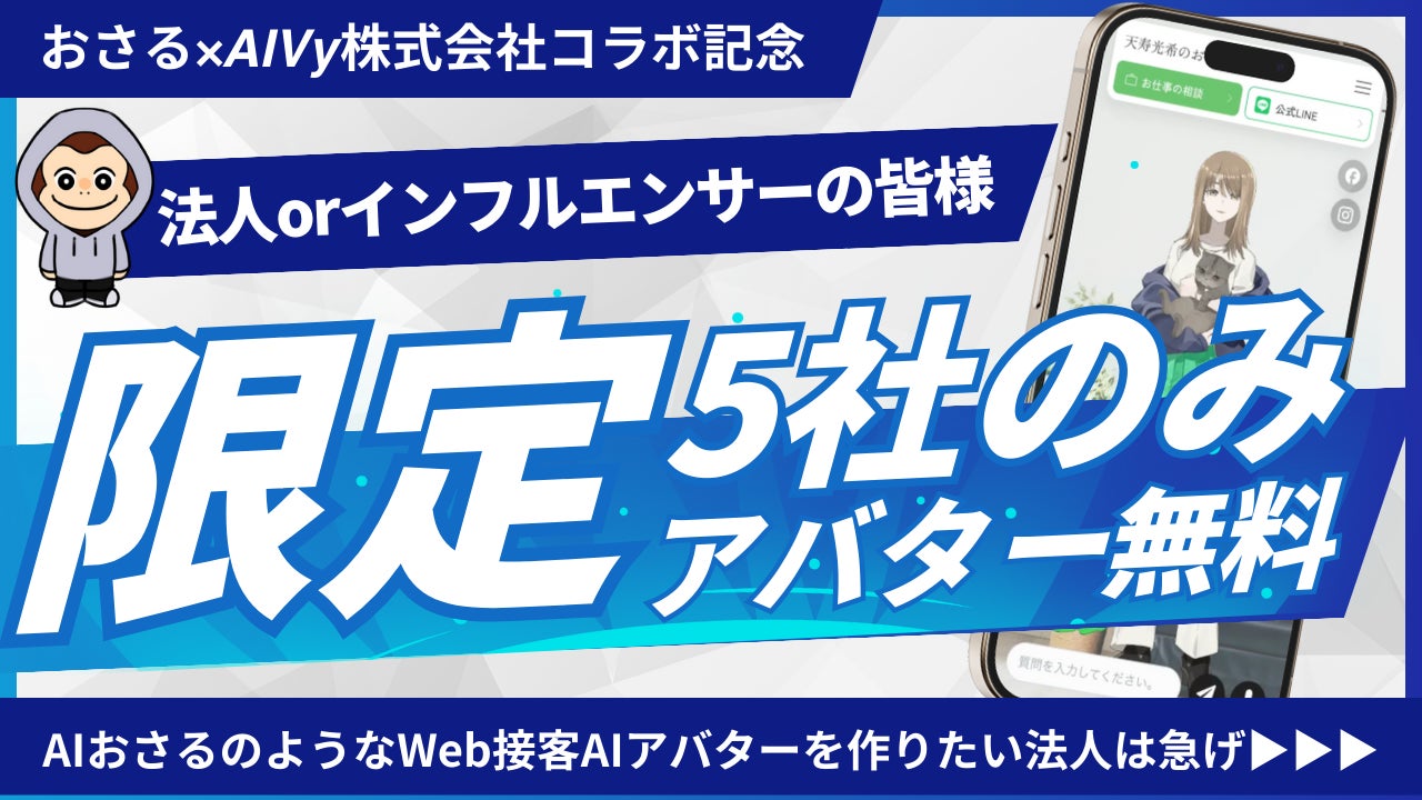 SNS総フォロワー数100万人を超える英語教育インフルエンサー「イングリッシュおさる」と、AIVy株式会社|アイビー(東京都港区/代表取締役:村上卓斗)が提供するWeb接客AIアバター「Pitaliy(ピタリー)」(https://aivy.tokyo/clp/)は、2024年12月より初めての試みとしてAIアバターで24時間365日ユーザーサポートを行うAIアバターをリリースしました。