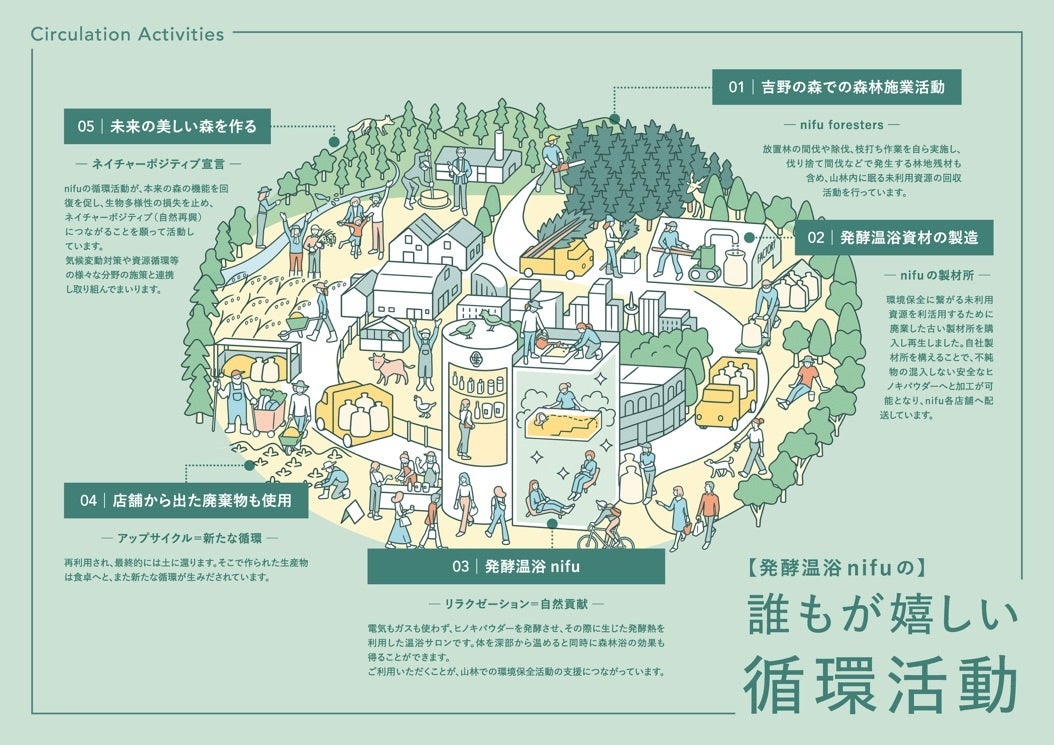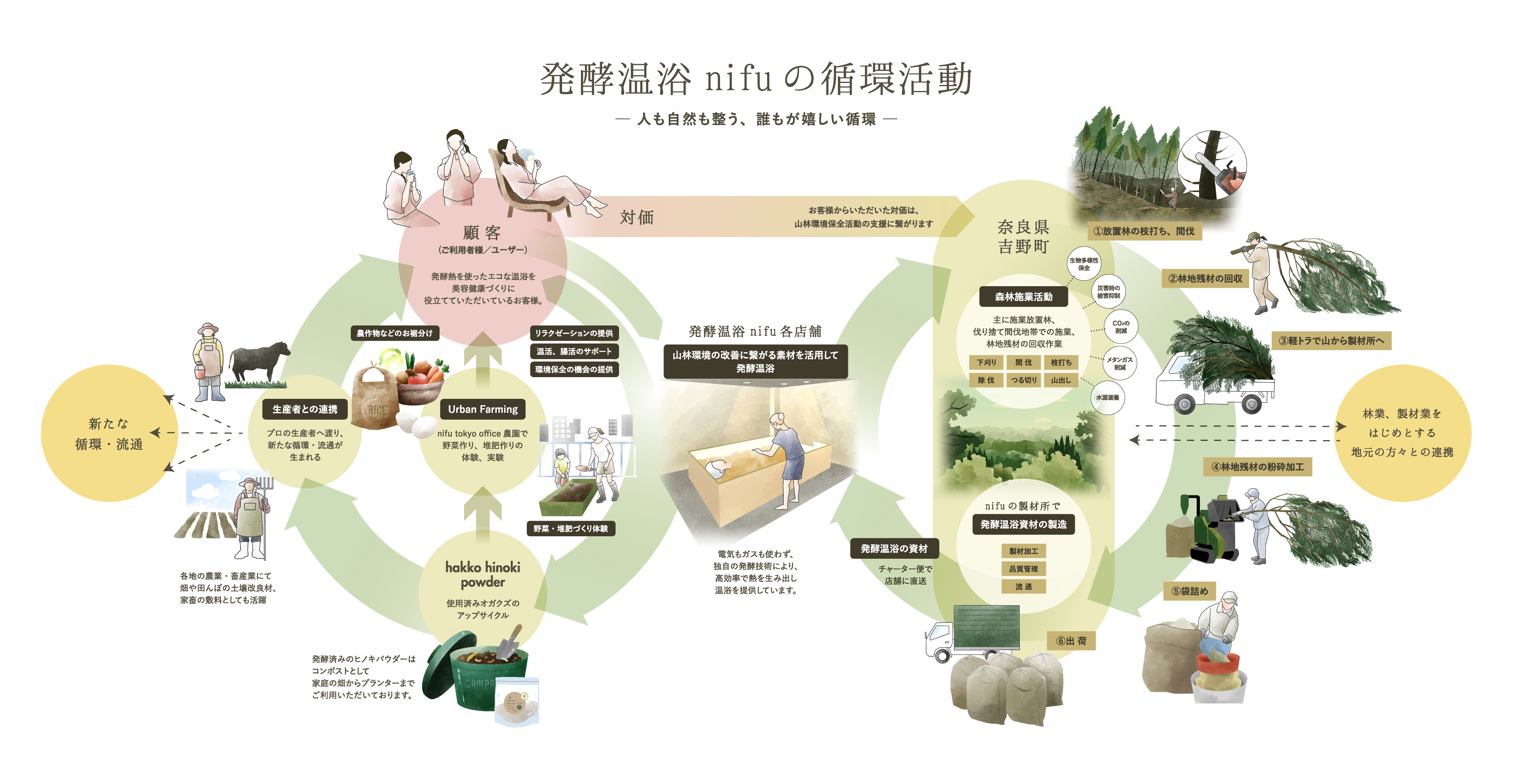 電気・ガスを使わず発酵熱のみを利用した温浴サロン『発酵温浴nifu』を展開。都会で暮らす女性の美と健康をサポートしています。 発酵資材には、山林課題となっている林地残材や放置林の間伐材を利活用できる仕組みを構築しました。 これは放置林、針葉樹林の再生による「カーボンニュートラルの促進」や「水源涵養機能の改善」ひいては「生物多様性の回復」など、30by30「G7 2030年 自然協約」 の考え方に則ったビジネスです。また、使い終わった資材は農業・畜産業などでアップサイクルされて新たな循環を生み出しています。 山林に眠る未利用資源の活用で、人も自然も美しくする誰もが嬉しい循環活動を広めています。
