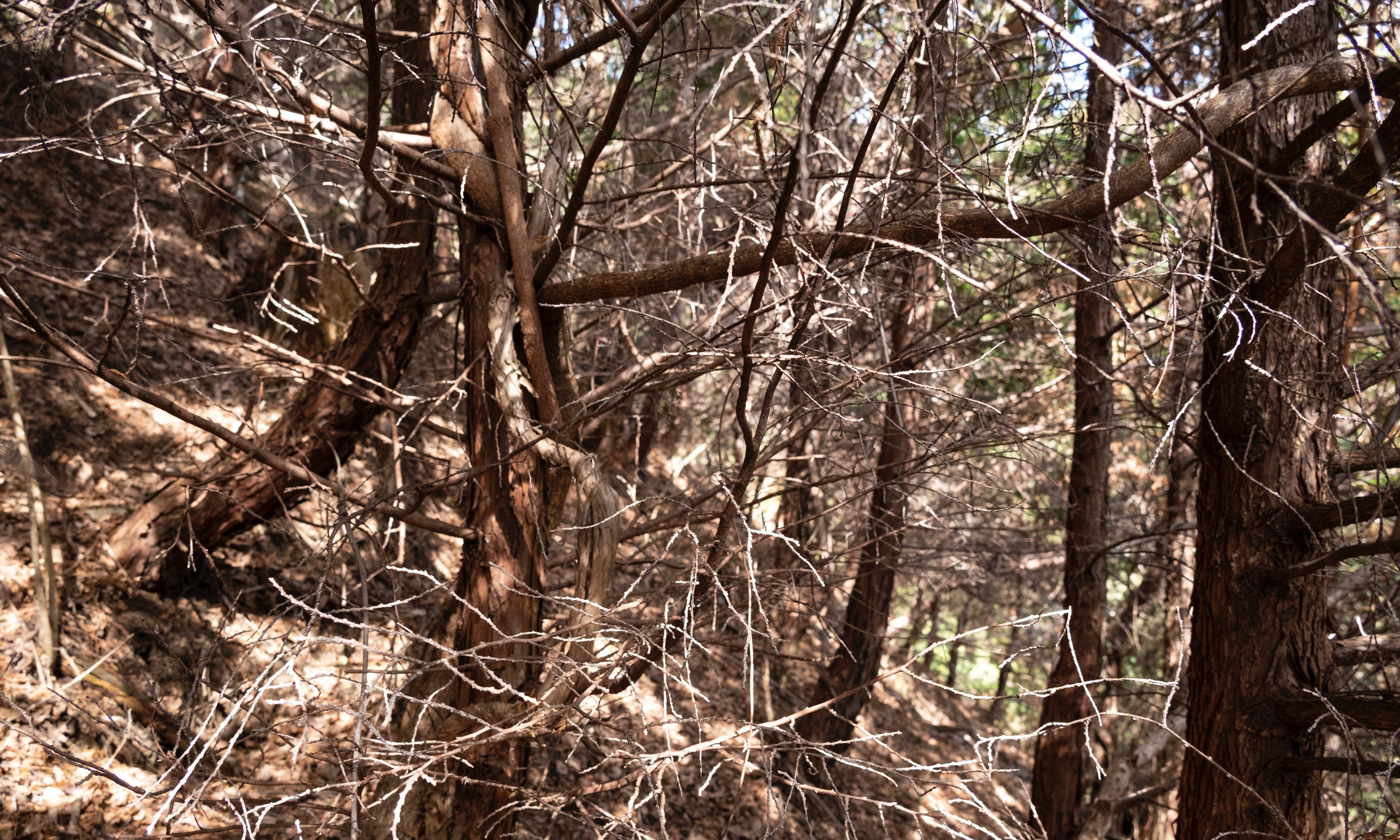 植林後に枝打ちや間伐等の必要な施業が行われていない放置林では除伐、間伐を行い、伐採した木々を山林内から搬出します。
