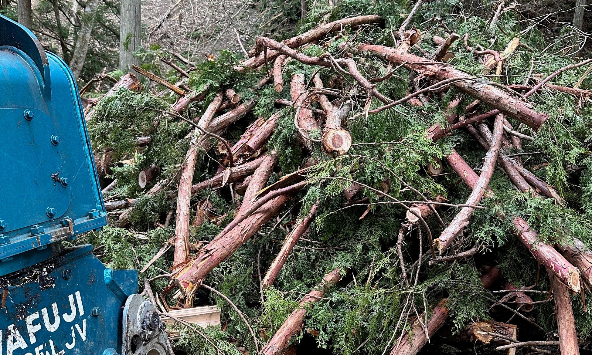 山林から回収する間伐材、林地残材は部位毎に選別し発酵温浴に最適な資材へと加工しています。