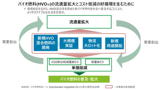概要:HVOベースの新たなバイオ燃料の開発と、近い将来のバイオ燃料のより一層の普及に向けたサプライチェーン増強及びその実証等を行う。