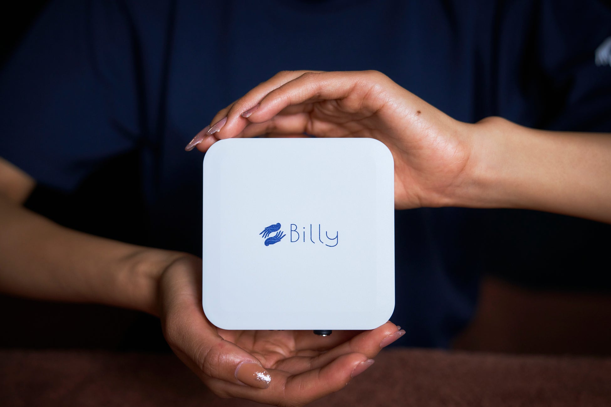 医師開発の業務用施術マシン「Billy」とは、柔軟かつ繊細な⼿袋型の電極「BillyHands」を用いて的確に筋肉を刺激することができ、また、単なる微弱な電流を使ったEMS(電気筋⾁刺激)装置とは異なり、計測装置を備えることで、より適切で有用な刺激を与えることを可能としています。施術は頭皮から足裏まで全身に使え、施術経験の有無に関係なく誰でも簡単に使用することができます。また一般的な施術マシンのような機器設置スペースは必要なく、10㎝×10㎝の超小型ボディでかつパワフルな施術が可能です。