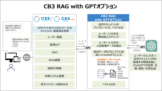 NDIソリューションズ株式会社(本社:東京都港区、代表取締役社長:岩井 淳文、以下NDIS)は、AIチャットボットCB3シリーズのオプション製品として「CB3 RAG with GPTオプション(以下RAGオプション)」の提供を開始しました。この新製品はAIチャットボットCB3シリーズに追加実装することで、企業固有の規程・ルール・機密情報を含んだ独自のChatGPT環境を、安全かつ迅速に実現できます。
