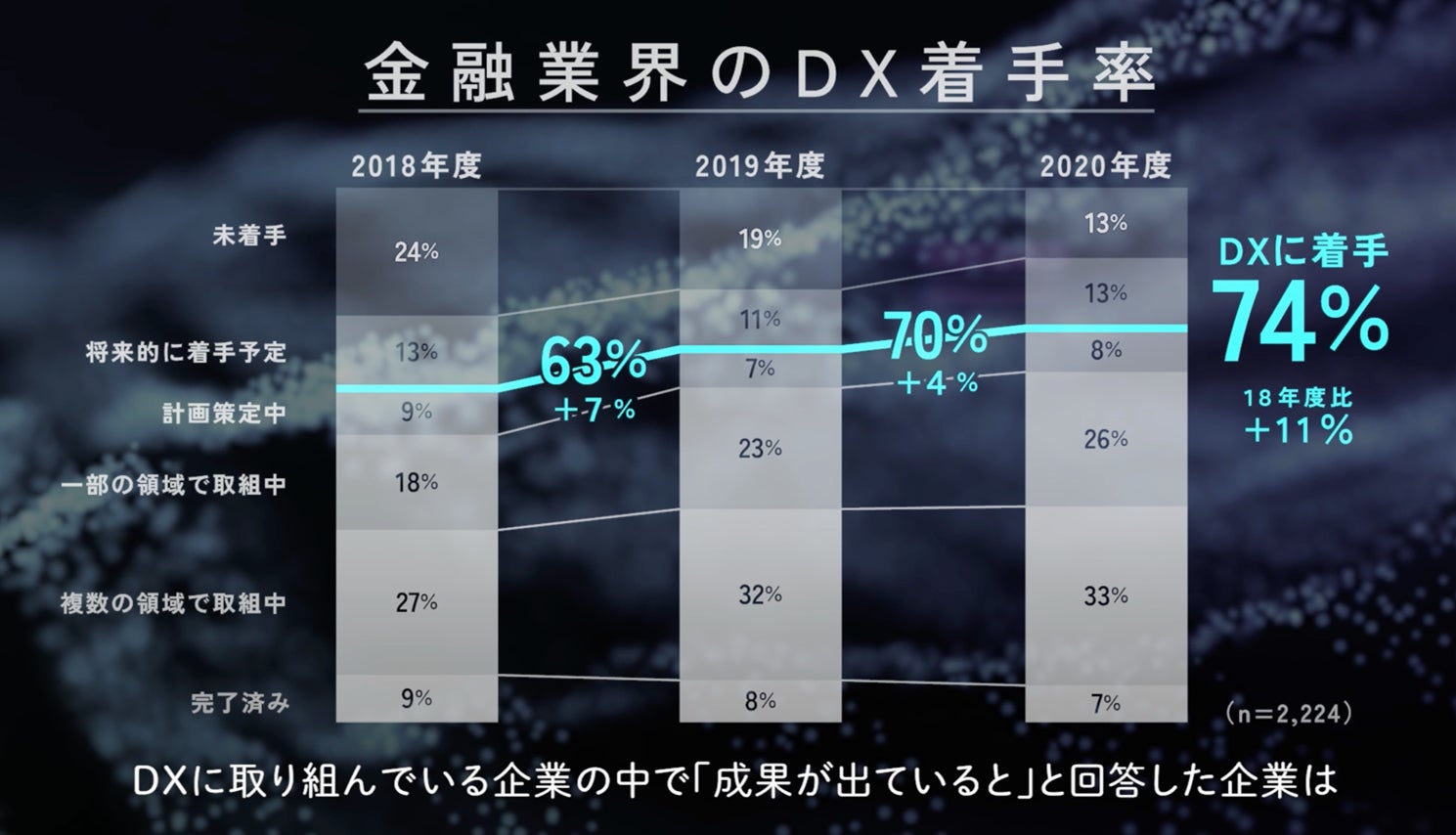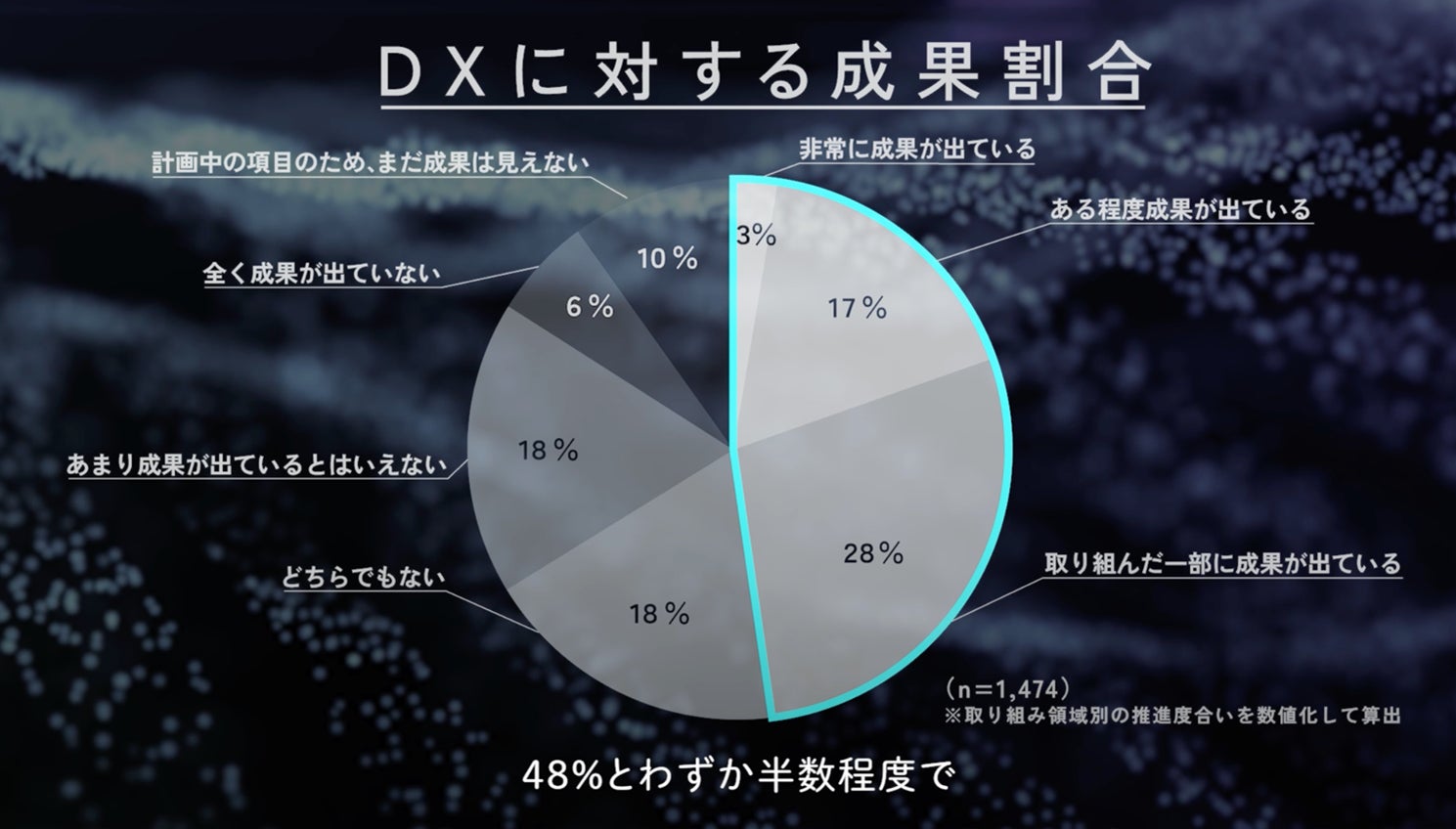 しかしながら、DXに取り組んでいる企業の中で「成果が出ている」と回答した企業は48%とわずか半数程度で、DXの効果を実感できていない、というのが実情です。