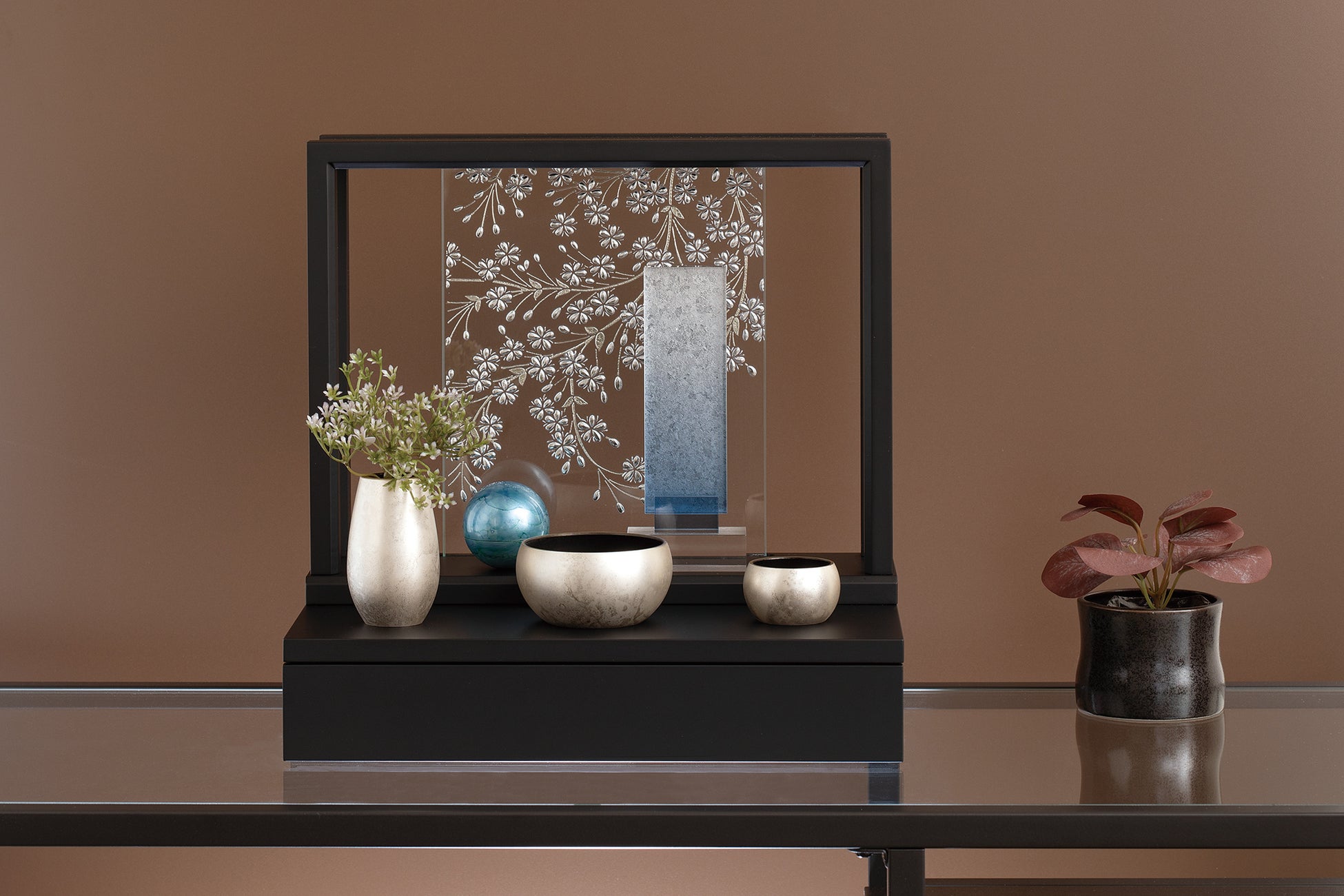 本商品で拘ったのは、背板には京都の伝統技法である金彩友禅を用いた「金彩友禅ガラス」を採用。光の当たり方によって繊細に色が移ろい、箔の輝きがきらめくたびに、心にそっと癒しを届けてくれます。