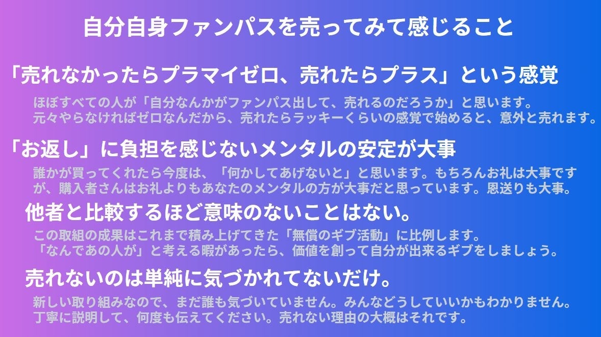 しかしα版を実施することで「主役だけでなく脇役でも輝ける」「これまでスキルのみではマネタイズできなかった人が、人間性(気質やコンピテンシー)の部分を活かして稼げる」「発行者と応援者の特別な関係性を後腐れなく作ることができる」「これまで商品を持ったことがない人が、ファンパスという商品を持つことでマーケティングや経営感覚を学べる」等、新たな特徴が見えてきました。