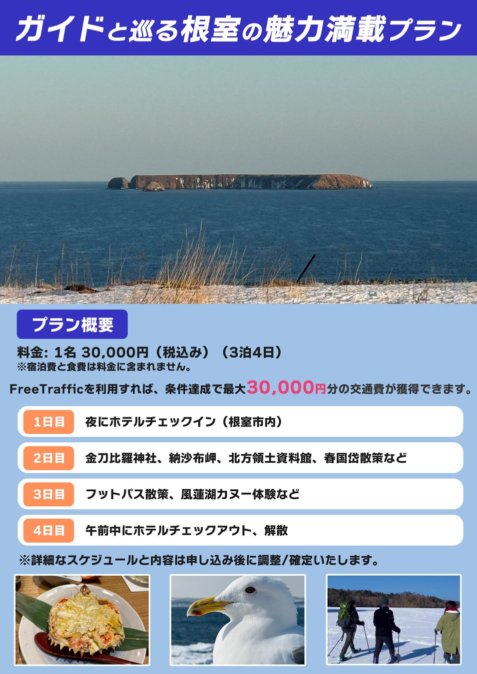 オプションで3泊4日の「ガイドと巡る根室の魅力満載プラン」にお申し込みできます。料金は1名30,000円(税込み)で、FreeTrafficを利用すれば条件達成で最大30000円分の交通費が獲得できます。