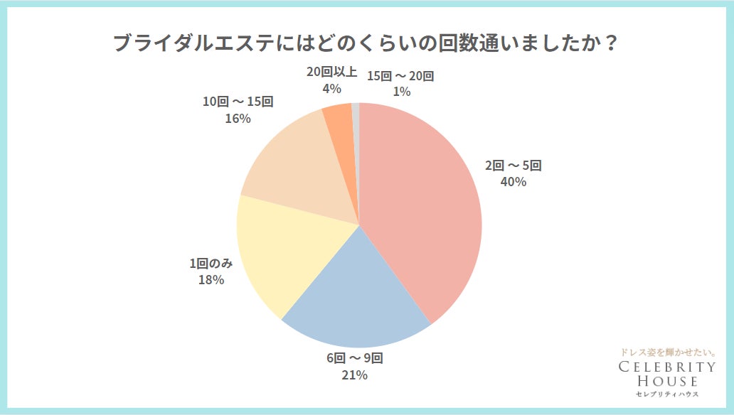 回数としては2回~5回が最も多く、ブライダルエステに通う期間を決めた理由・軸としては、「自分の希望に合うエステの内容や目標にかかる日数を結婚式の日から逆算して決めた」「ターンオーバーや肌が落ち着く期間を考慮した日程にするようアドバイスを受けたから」「エステで案内されたスケジュール毎のプランを参考にし、お金をかけすぎないことを意識して決めました」など、金銭面での理由や、結婚式の日程が理由に上げられました。