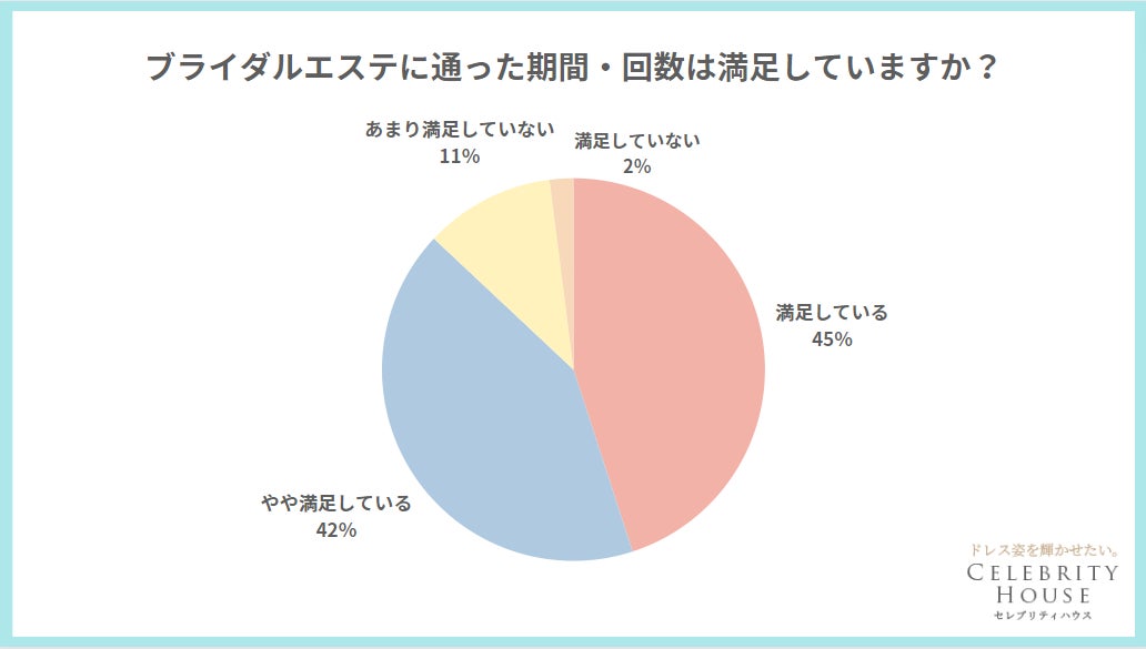 ブライダルエステには結婚式の「前日~1ヶ月前」から通う方が最も多く、期間としても前日か~1ヶ月間と答えた方が最も多いという結果になりました。答えた方が最も多く、期間・回数に満足したと答えた方は45%となりました。