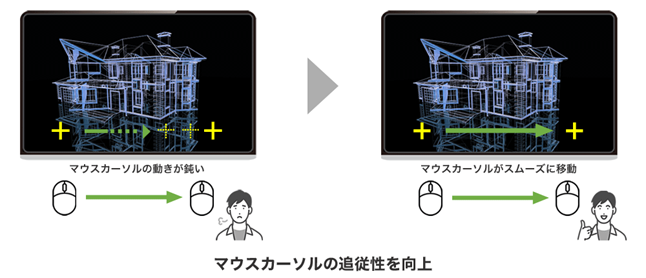 マウス操作の制御を最適化し、グラフィック作業時(CAD、BIM(*3)など)におけるマウスカーソルの追従性を向上させました。