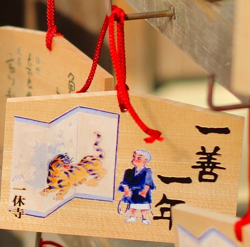 善哉という言葉は元々、仏教用語からきています。一休禅師はあるとき、小豆の炊いた汁をごちそうになりあまりに美味しかったためにおもわず「善哉」といったそうです。お経にもこの二文字を見ることが出来ます。釈尊が弟子に与えた言葉です。「いいね」その質問いいね!その視点鋭いね!とんちとは物の見方とも言えます。絵馬に今年一年の(・∀・)イイネ!!を書きましょう。また善哉は赤い小豆を使用していることから厄除けにもなると言われ関西の節分ではお善哉をふるまわれることがあります。