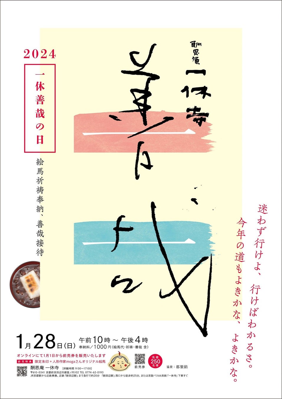 一休禅師晩年の寺、一休寺では今年も毎年恒例の「一休善哉の日」を開催します。こちらは毎年一月の最終日曜日に行うもので、絵馬の祈祷奉納、善哉の接待があります。