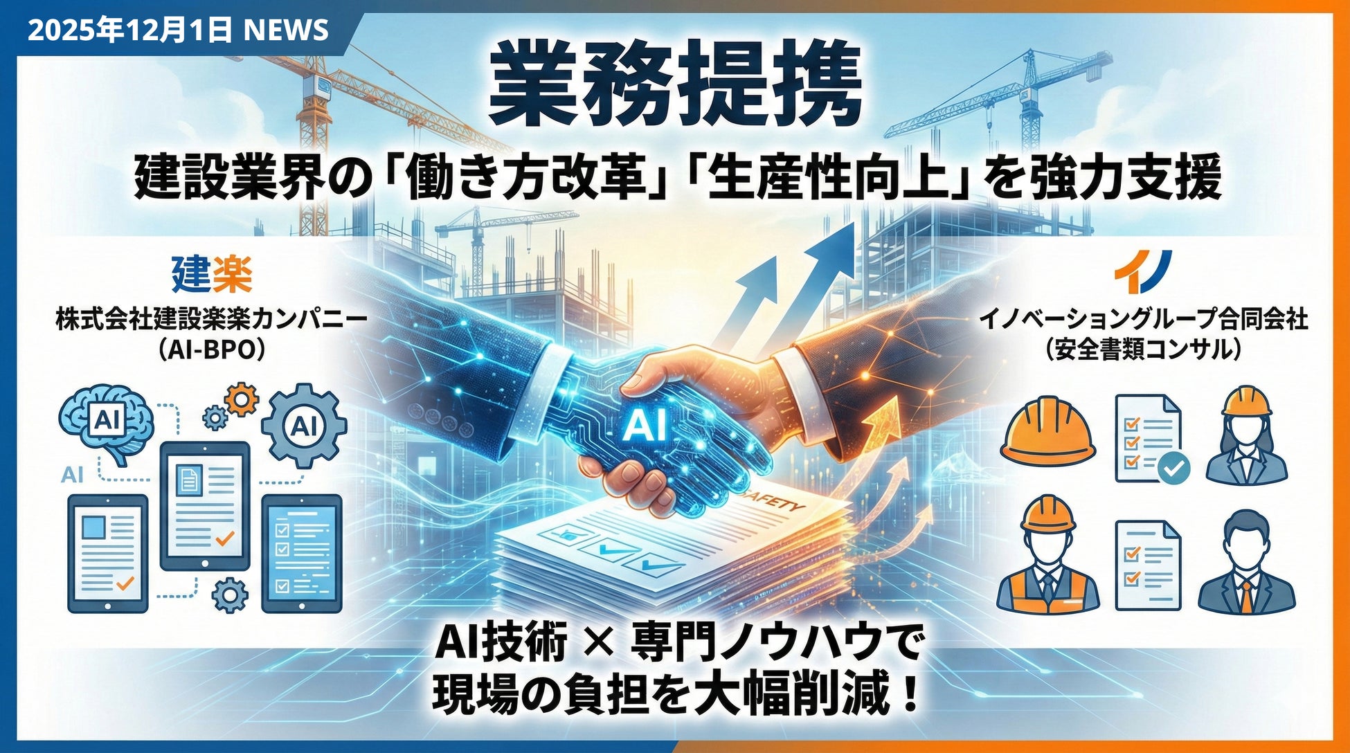 建設業界向けAI-BPOサービスを展開する株式会社建設楽楽カンパニー(本社:東京都千代田区、代表取締役:中川優志、以下「建設楽楽カンパニー」)は、建設業の安全書類に特化したコンサルティングサービスを提供するイノベーショングループ合同会社(本社:大阪府大阪市、代表社員:川畑真吾、以下「イノベーショングループ」)と、業務提携を締結いたしました。