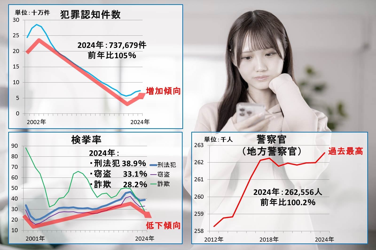 警察官の人員数は、2024年に過去最高の262,556人となりました。しかし、犯罪認知件数の増加傾向及び検挙率の低下傾向に歯止めがかからない状況を考えると警察のみに頼ることは困難です。