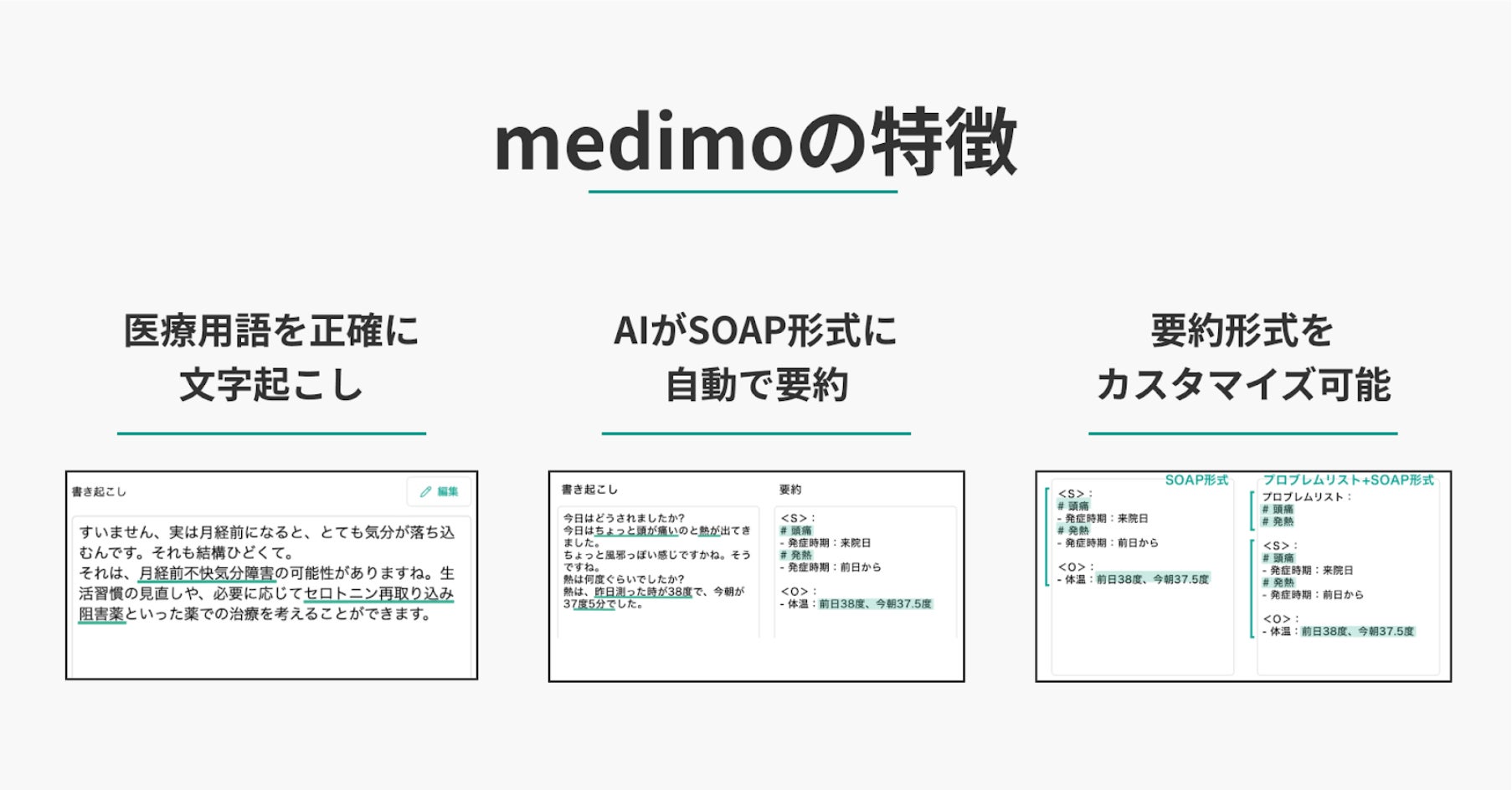 こうした状況に対応するため、Pleapはカルテ作成業務を支援するAIツール「medimo」を開発しました。「medimo」は、診察時における医療従事者と患者の会話を音声認識で自動的に書き起こし、生成AIが要約を行ってカルテ原稿を作成するシステムです。