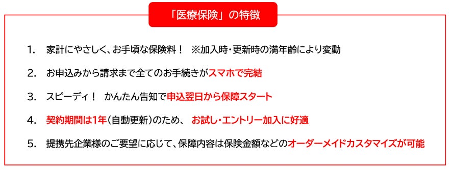 また、提携先企業様が保有するお客様接点や経営戦略上のニーズも多様化していることから、当商品は、予め決められた商品パッケージで提供するのではなく、提携先企業様のご要望に応じて、保障内容や保障金額などをオーダーメイドカスタマイズして提供することが可能になっている新たな医療保険としております。