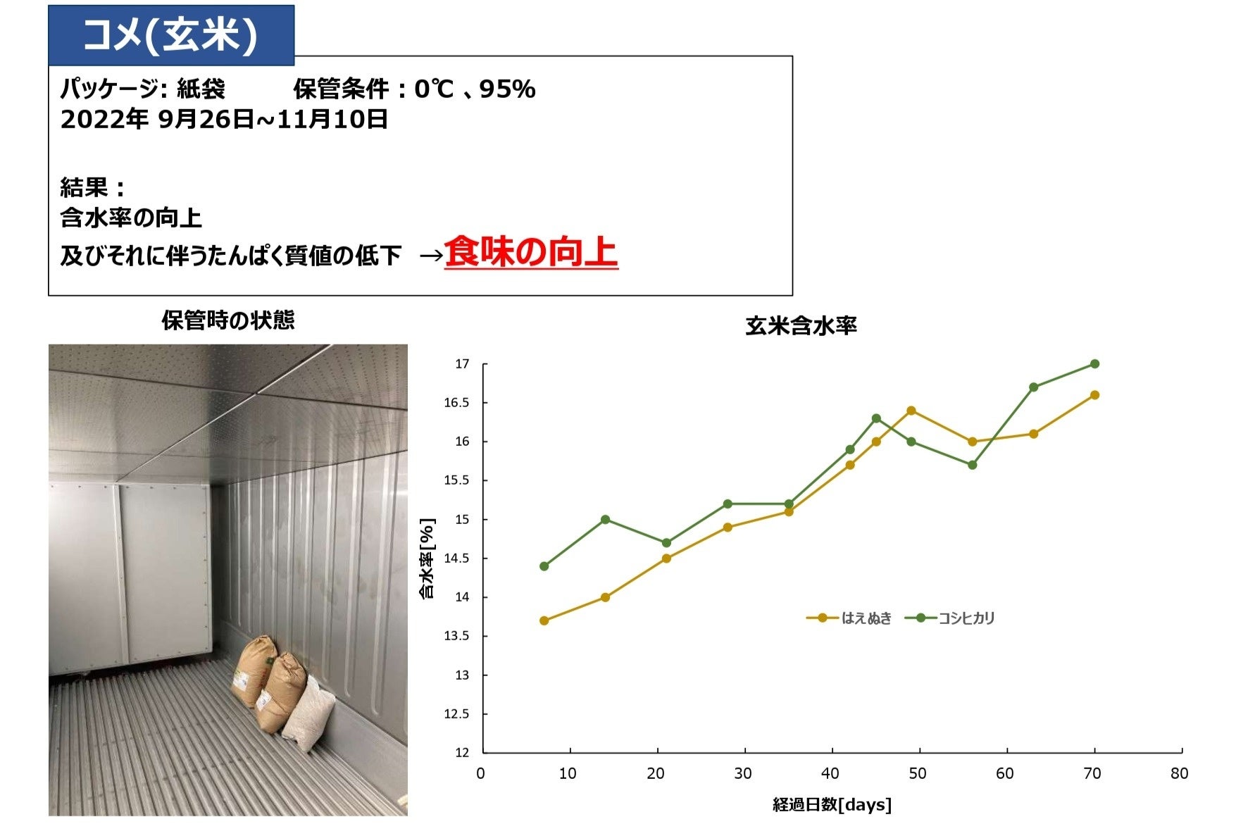 最近なにかと話題の備蓄米、古米や古古米であっても、保管試験の結果、高湿度空間で保管することにより、水分値の上昇(およびその他成分値の向上)が見られ、食味向上に貢献しております。
