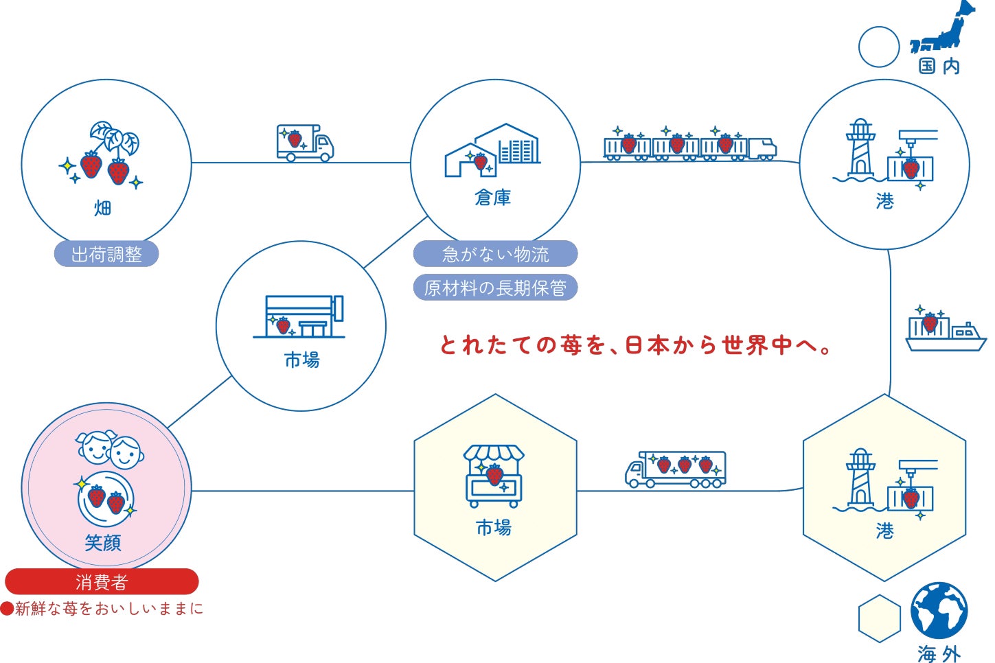 コールドチェーンとは、生産地から消費地まで冷蔵の状態を繋ぎ、鮮度を保持する流通の仕組みです。