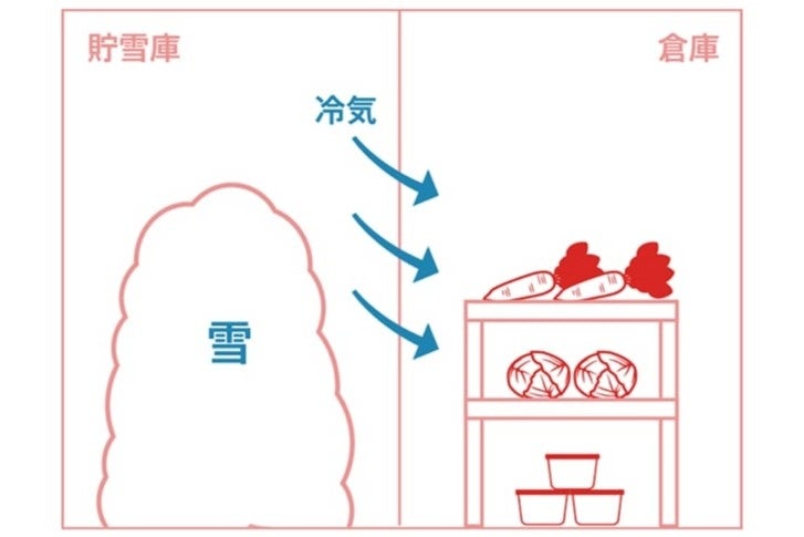 雪によって冷やされた空気を倉庫内で循環させる仕組み。