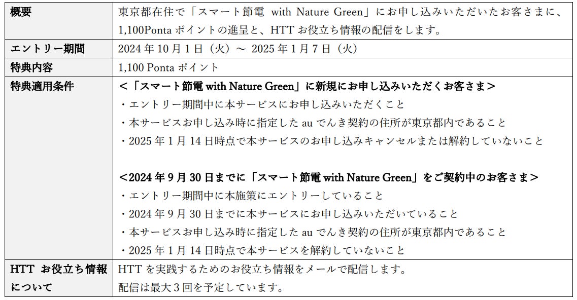 auエネルギー&ライフ(以下 当社)は2024年10月1日、東京都と連携して、電力安定確保や脱炭素化に向けたアクション「HTT」の推進施策(以下 本施策)を開始しました。本施策は当社が提供する家庭向け節電サービス「スマート節電 with Nature Green」(以下、本サービス)にお申し込みいただいた方を対象としており、1,100Pontaポイントを進呈するほか、節電情報などHTT関連情報を月に一度メール配信します。