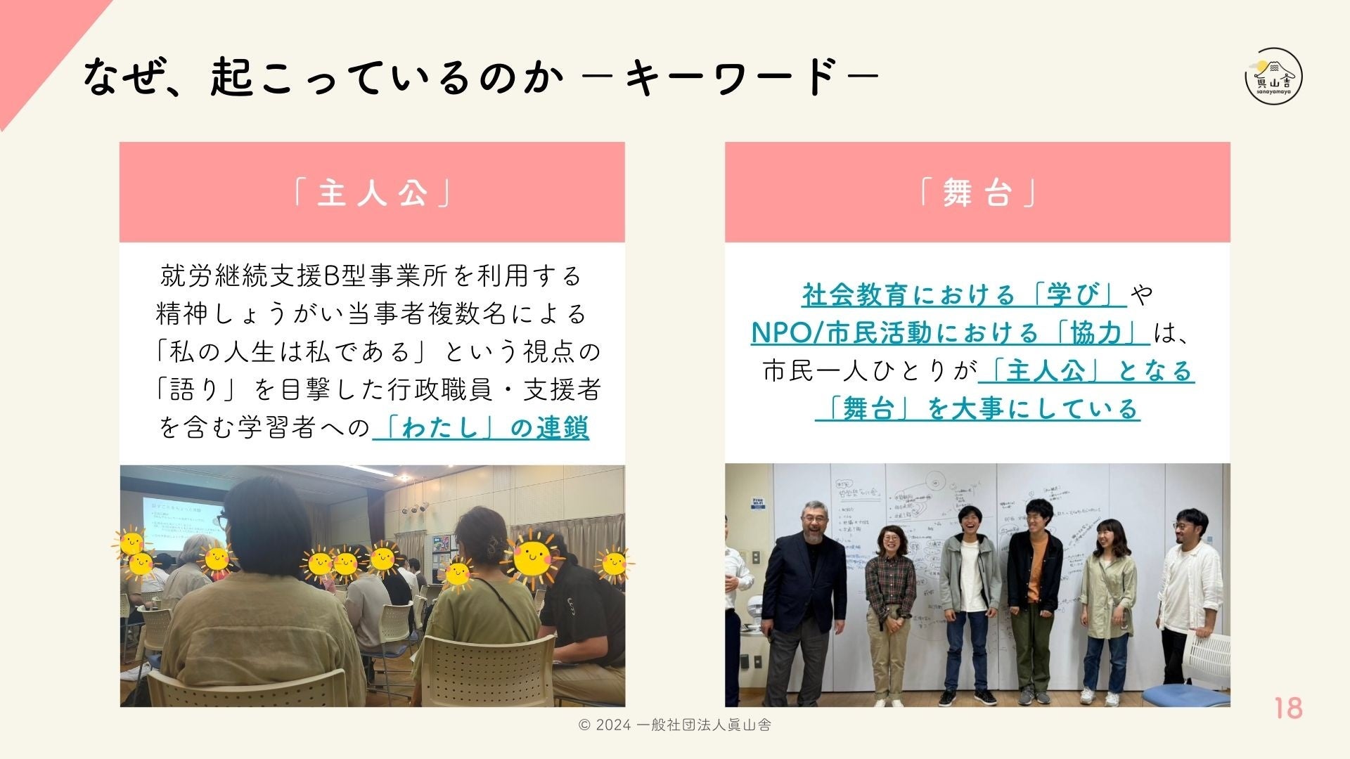 最後に、令和6年度の仮説として、「リカバリーの学校@くにたち」の参加者が、ほかの参加者やコーディネーターと共に企画づくりなどを通して(当事者参画型プログラムとして「共につくる学びと交流プログラム」を実施)、「主人公」として自分自身の「舞台」をもつ機会を創出し、「回遊性」、「越境性」、及び「共生圏の拡張」を推進することを発表しました。