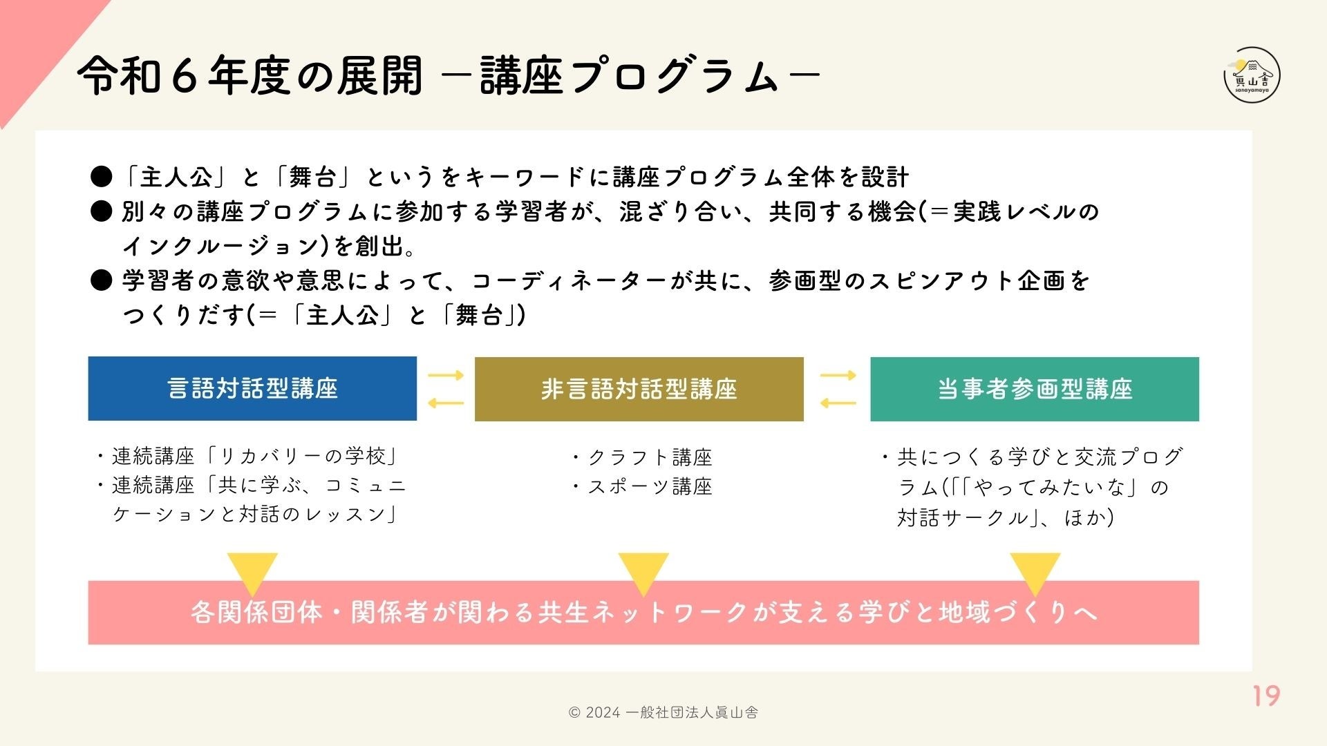 「リカバリーの学校@くにたち」とは、「キョウドウを生きる暮らし」を事業のビジョンに掲げ、一般社団法人眞山舎(さなやまや)が、文部科学省「学校卒業後における障害者の学びの支援推進事業」を受託し、国立市で2023(令和5)年度から国立市公民館及び市内福祉事業所などと連携して実施しています。令和5(2023)年度の取り組みを経て、令和6年度からは、〈主⼈公〉と〈舞台〉というキーワードをベースに、3つの軸(⾔語対話型、⾮⾔語対話型、当事者参画型)で講座プログラムを展開しています。別々の講座プログラムに参加する学習者が、混ざり合い、共同する機会(=実践レベルのインクルージョン)を創出し、コーディネーターが中⼼になって、学習者と共に当事者主体のスピンアウト企画を作ることを企図します。こうした「リカバリー」の学びの地域実装によって、前年度の実践研究によって導き出された実践仮説である、学習者・⽀援者を含む各主体の〈回遊性〉と〈越境性〉を⾼め、〈共⽣圏の拡張(=地域レベルのインクルージョン)〉を⽬指しています。