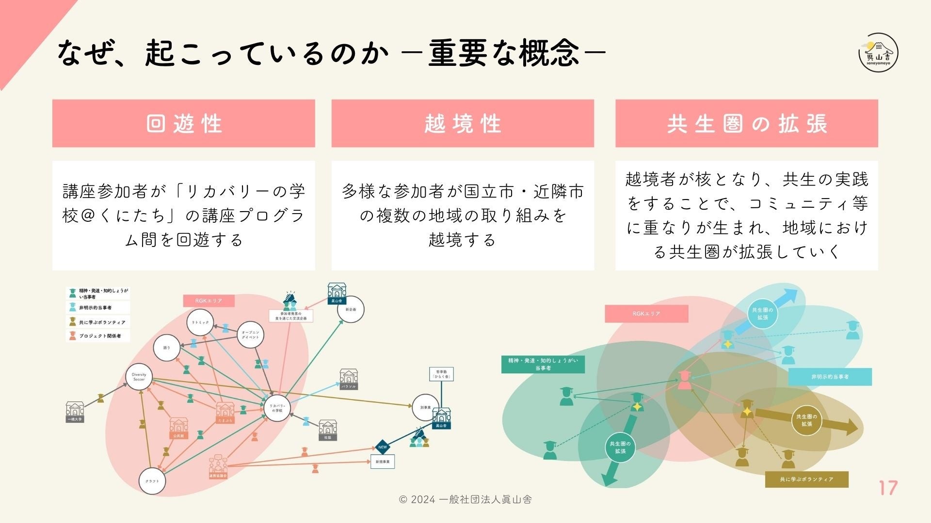 また、既出の正の変化の仮説として、連続講座「リカバリーの学校」などの安心安全の場から講座参加者が複数の講座プログラム間を行き来する「回遊性」、及び多様な参加者が国立市及び近隣市の「リカバリーの学校@くにたち」以外の場に出入りする「越境性」が大きく関係している可能性を示唆。そして、越境する者が核となり、共生の実践をすることで、別々のコミュニティの一部が重なり合い、地域全体における「共生圏の拡張」が生まれるという仮説も提示しました。