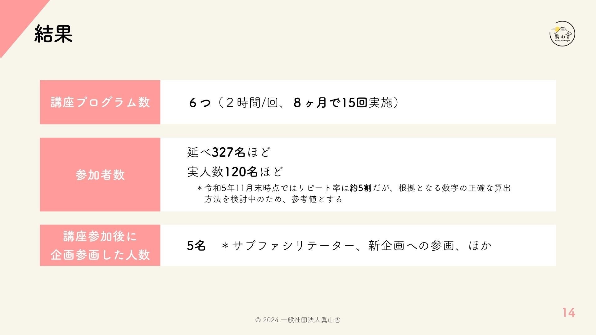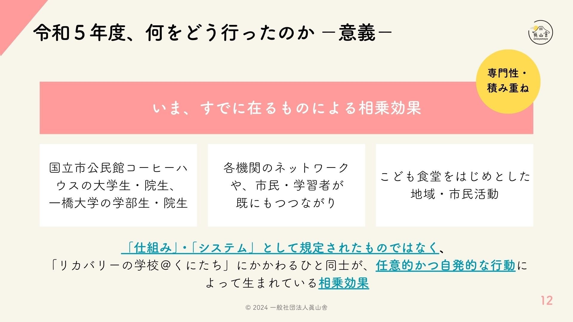 同時に、令和5(2023)年度に確認された変化の多くは、長年の間に国立市内で培われてきた多様な取り組み(特に、社会教育、地域福祉、市民活動)により蓄積されている専門性・積み重ねによってなされているものであるという視点を共有し、必ずしも「リカバリーの学校@くにたち」だけによる正味の変化ではないことにも言及しました。